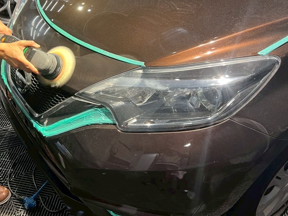 ブロアで水滴を飛ばし、ポリッシャーで磨く際に当たってはいけない箇所、磨き粉の浸入を防ぎたい箇所をマスキングテープで保護していきます。