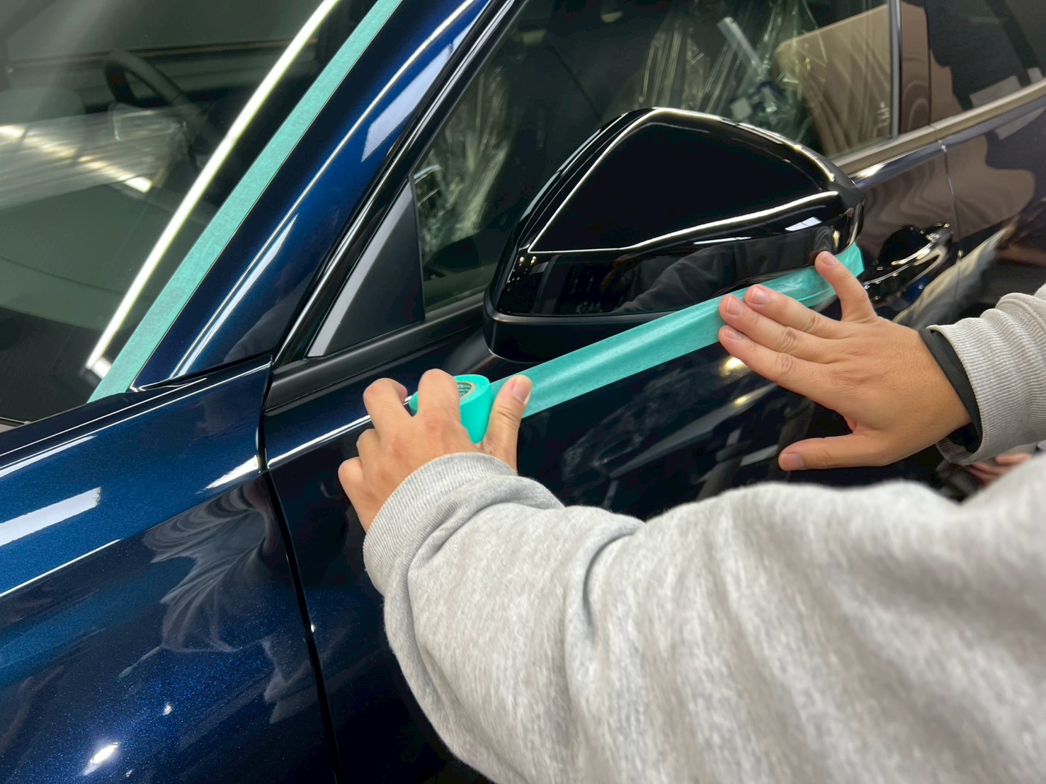 ブロアで水滴を飛ばし、ポリッシャーで磨く際に当たってはいけない箇所、磨き粉の浸入を防ぎたい箇所をマスキングテープで保護していきます。