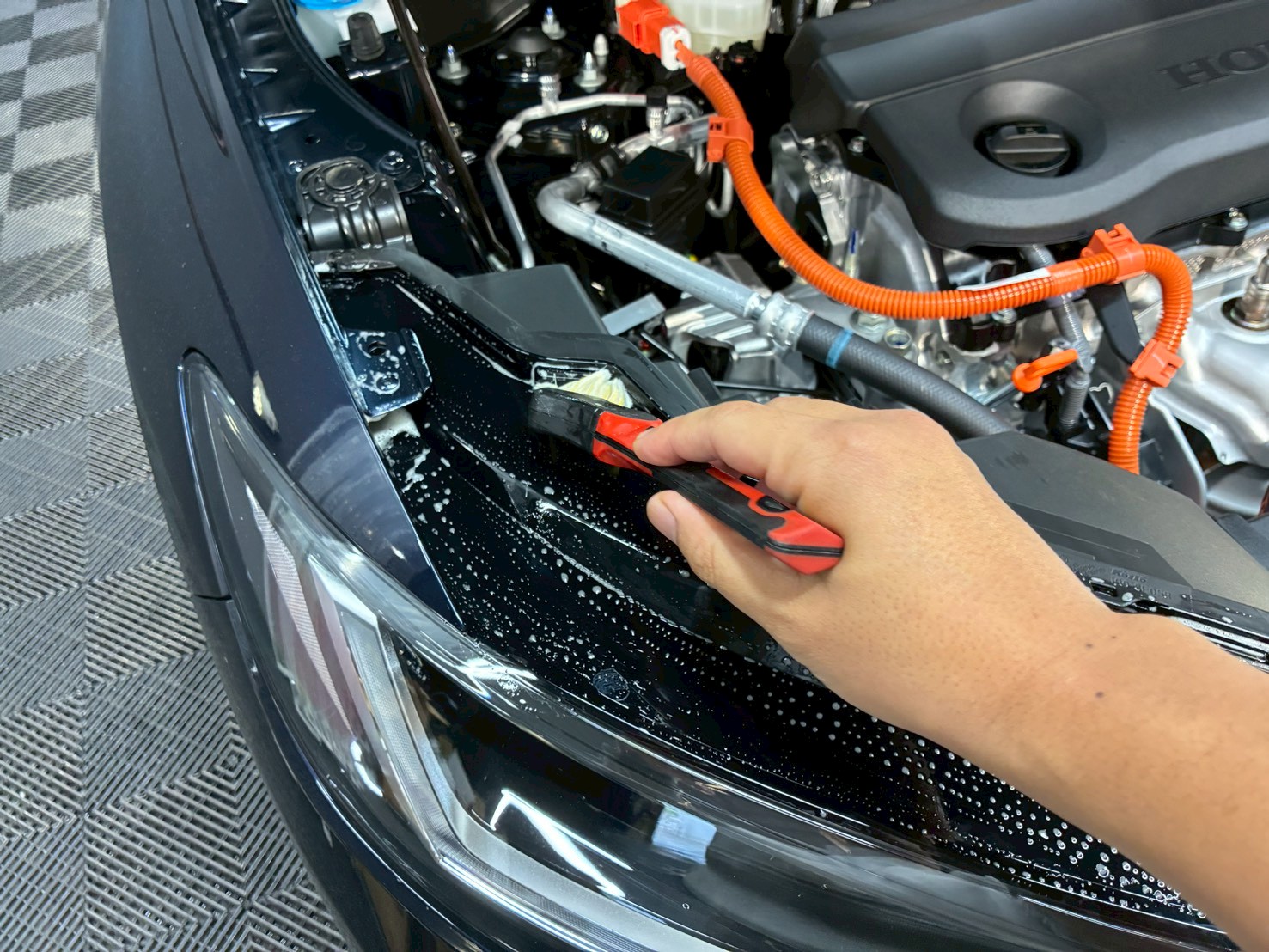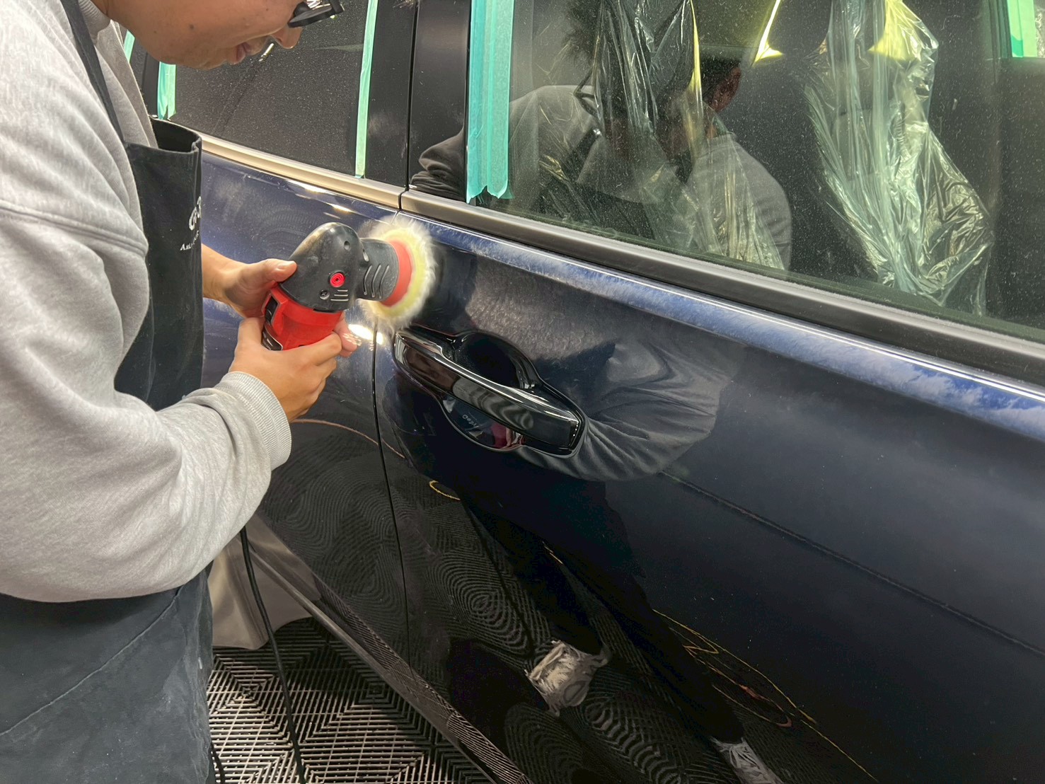 脱脂、仕上げ作業(ドアの内側や隙間の磨き粉の除去、窓清掃、ホイール仕上げ、室内清掃)