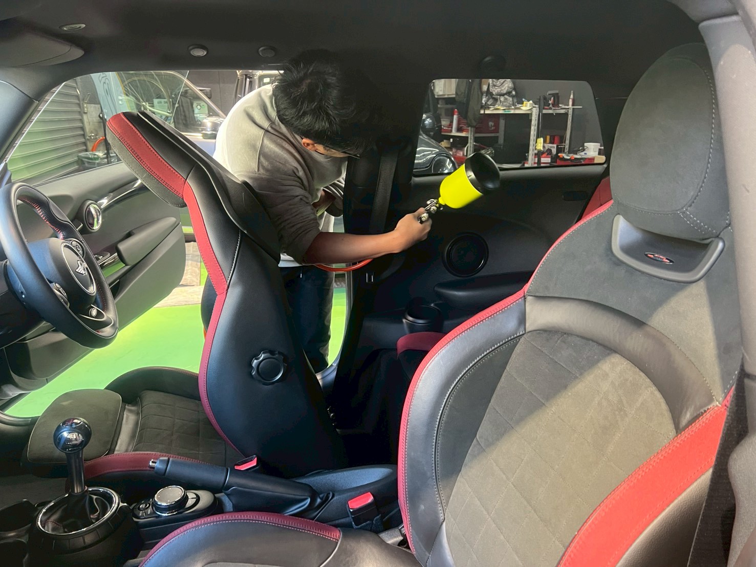 今回のミニ JCWは、車内のタバコの臭いが気になるということで、ナノゾーンコートモビリティを施工させていただきました(^^)/