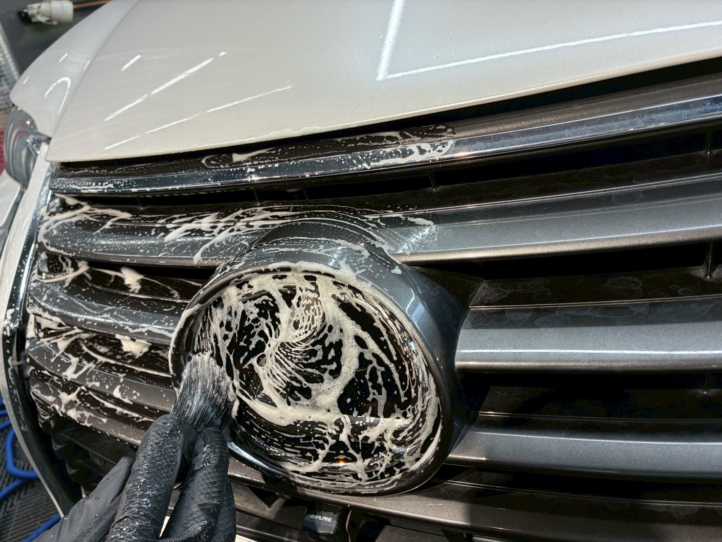 まずは、ボディ洗車、ドアヒンジのクリーニング、ケミカル剤によるクリーニングをしていきます。