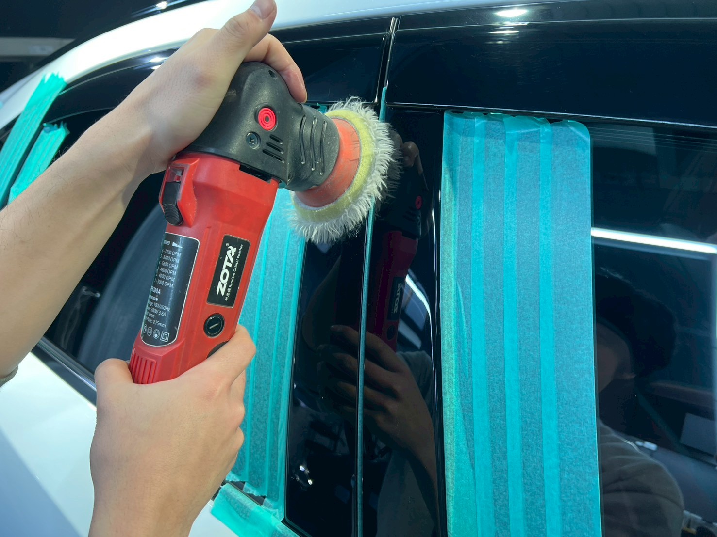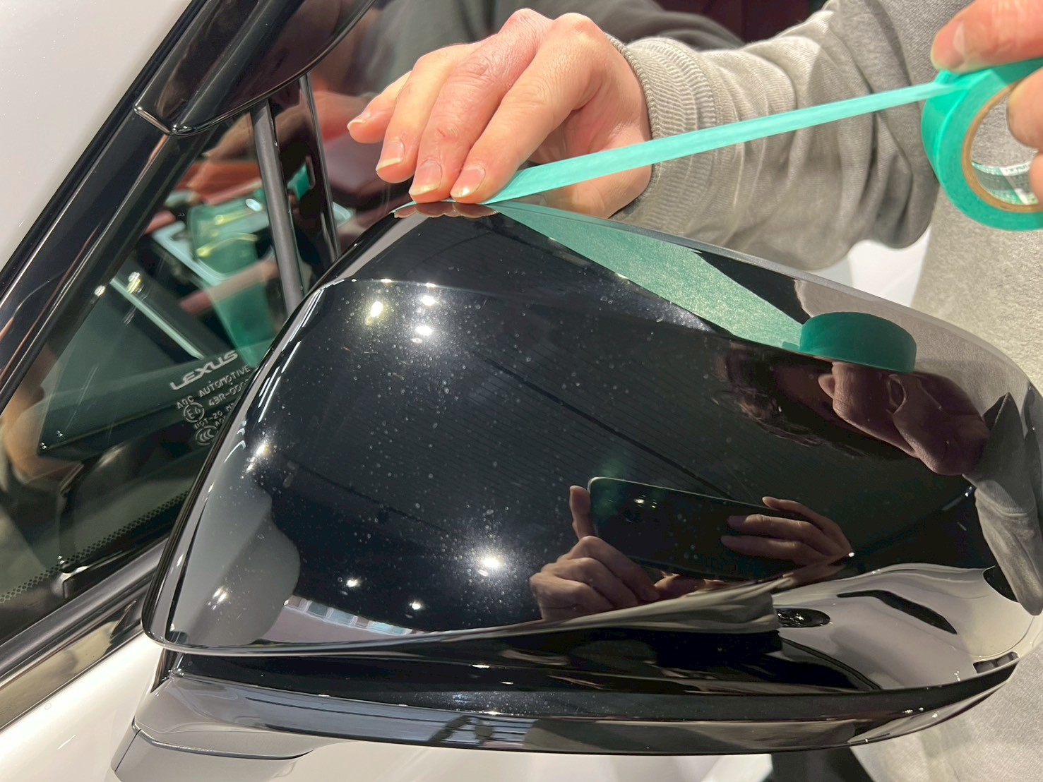 ブロアで水滴を飛ばし、ポリッシャーで磨く際に当たってはいけない箇所、磨き粉の浸入を防ぎたい箇所をマスキングテープで保護していきます。