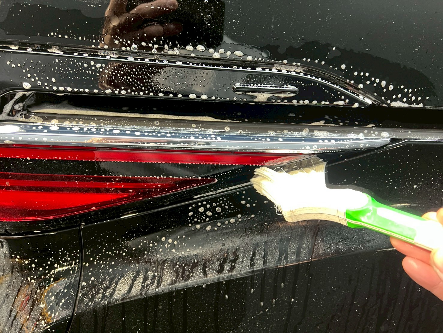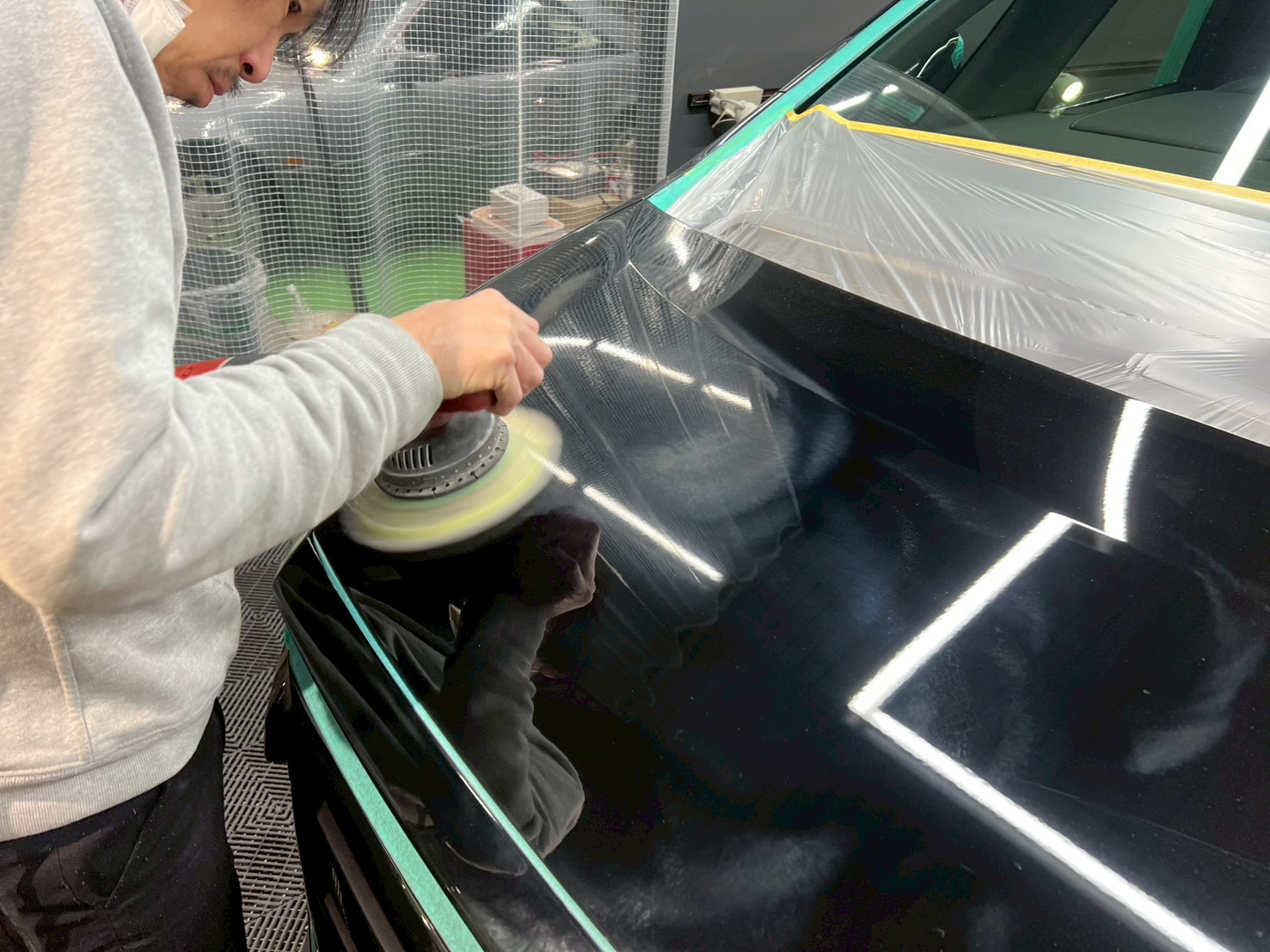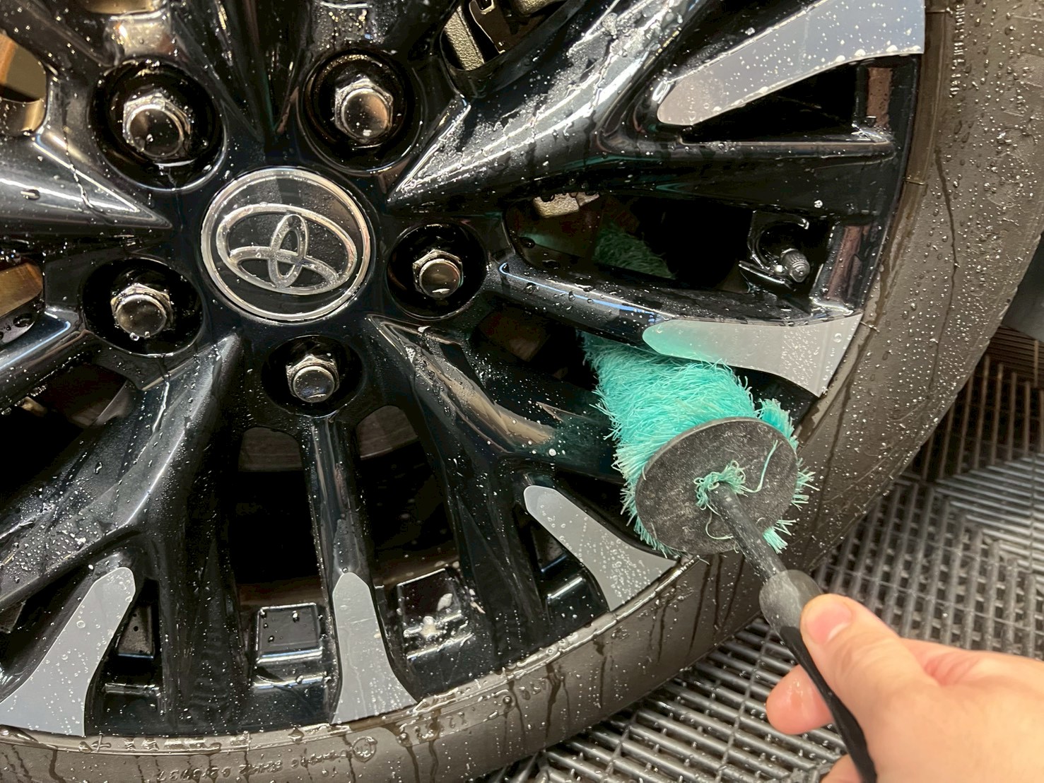脱脂、仕上げ作業(ドアの内側や隙間の磨き粉の除去、窓清掃、ホイール仕上げ、室内清掃)