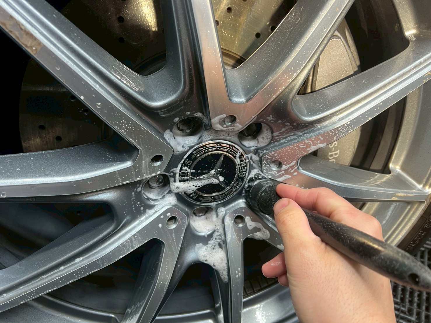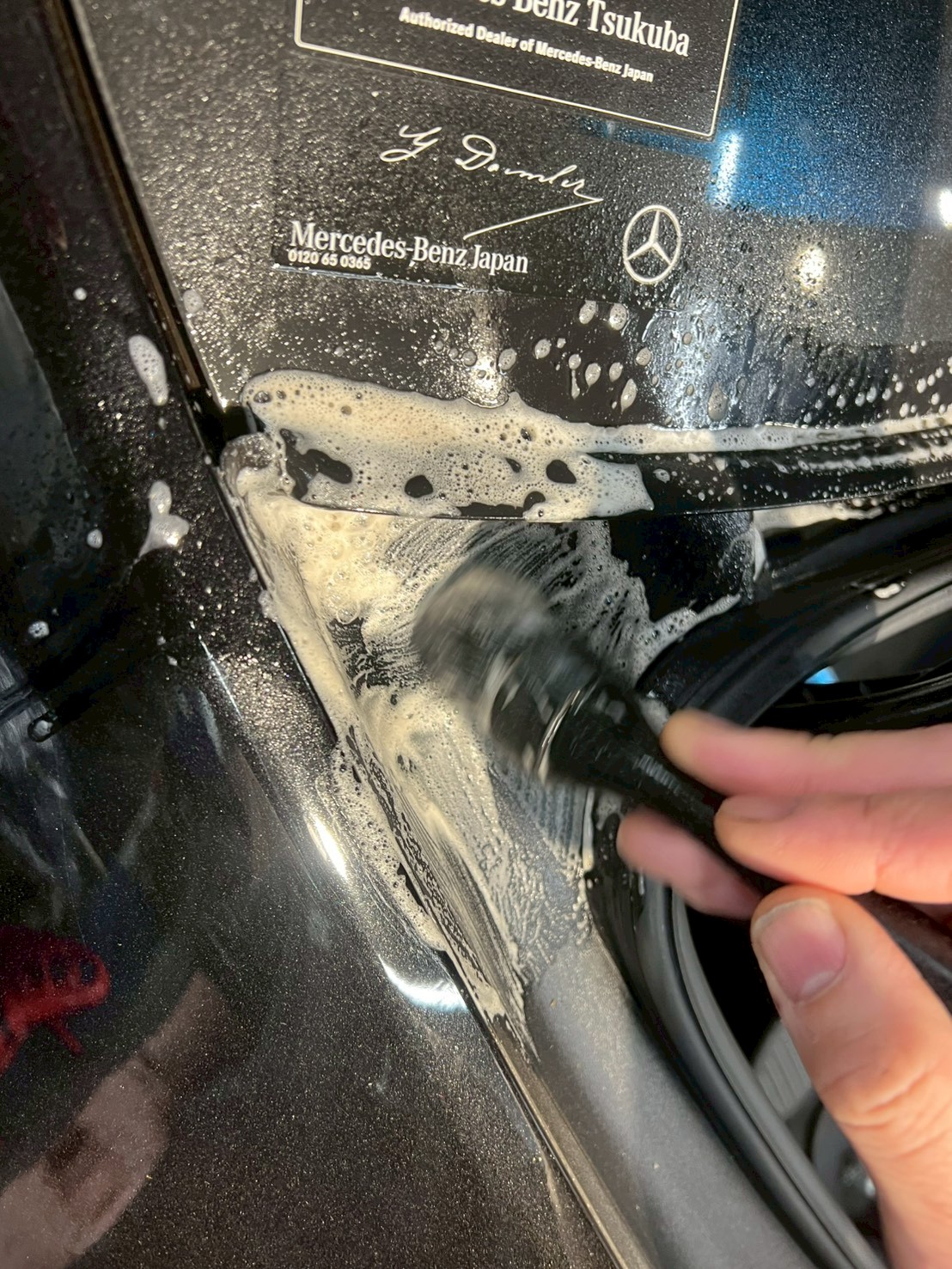 脱脂、仕上げ作業(ドアの内側や隙間の磨き粉の除去、窓清掃、ホイール仕上げ、室内清掃)