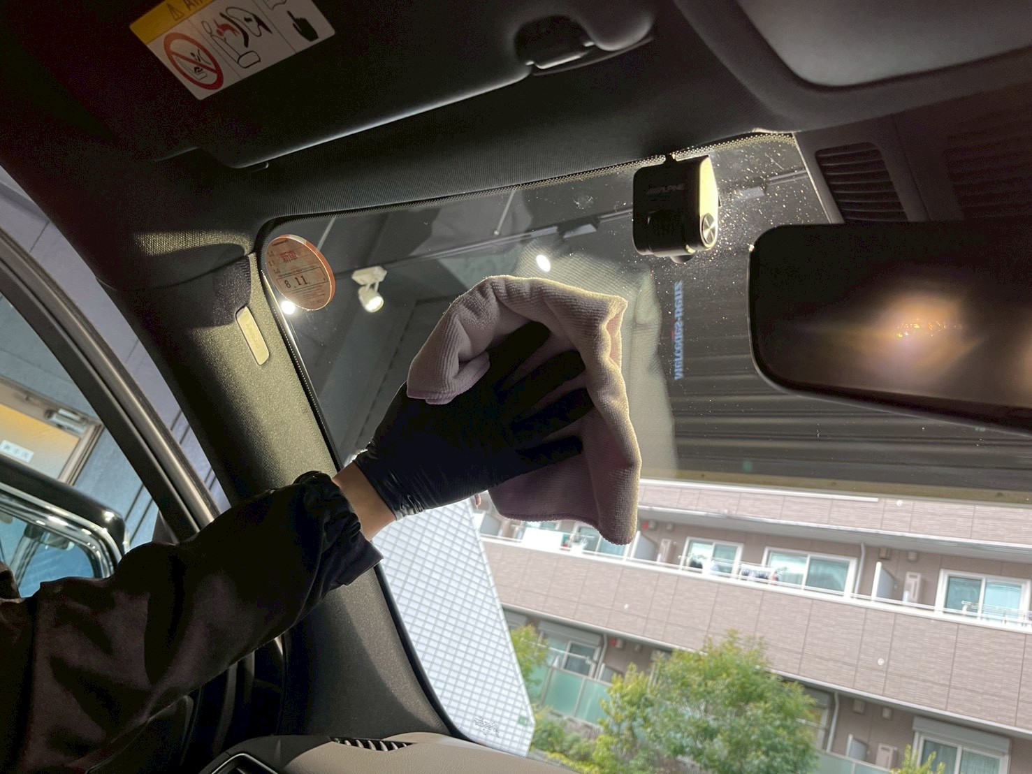 運転席と助手席の掃除機、フロントガラスの内窓とダッシュボードの拭き上げ