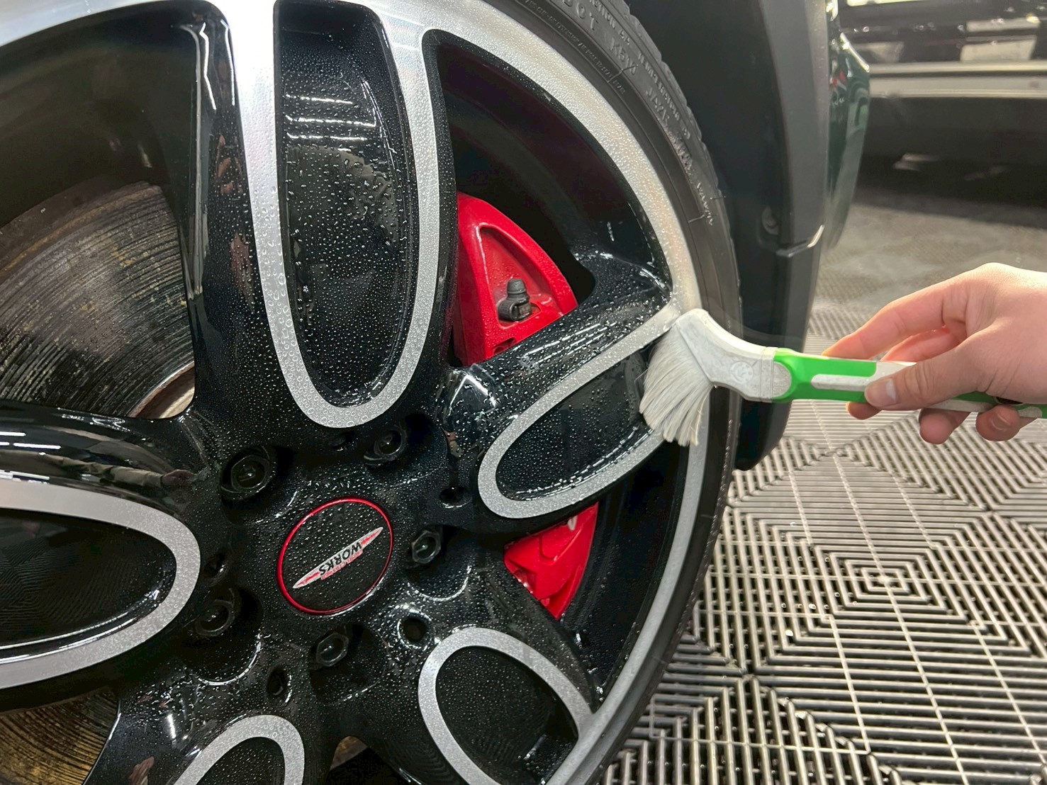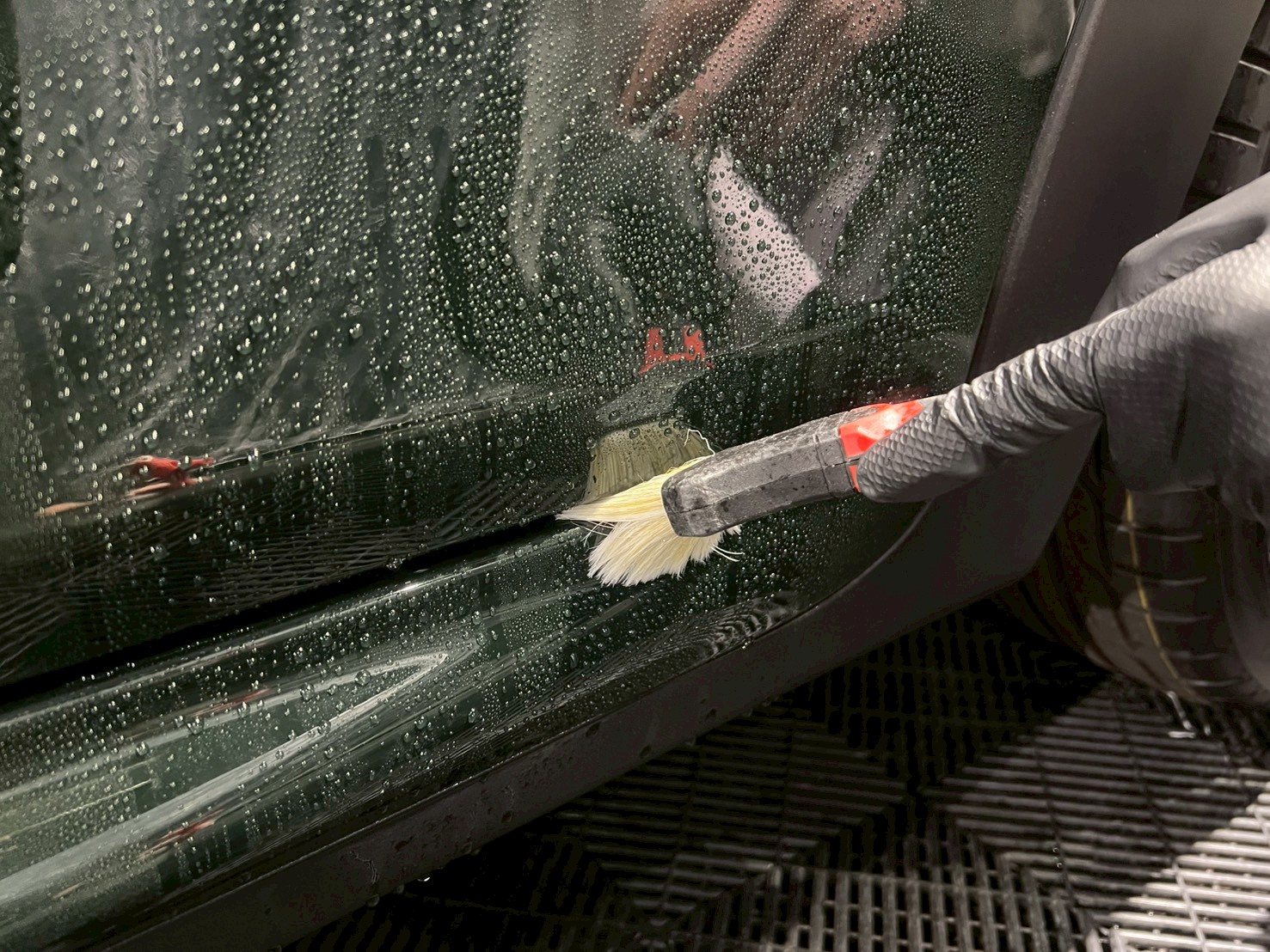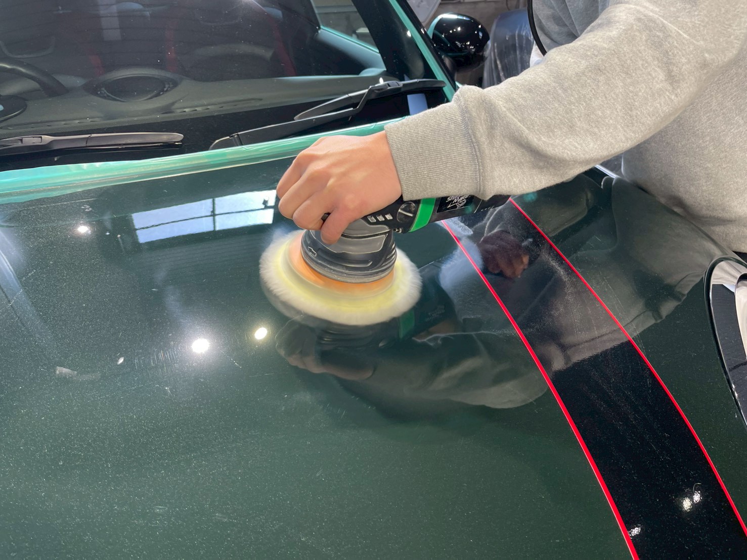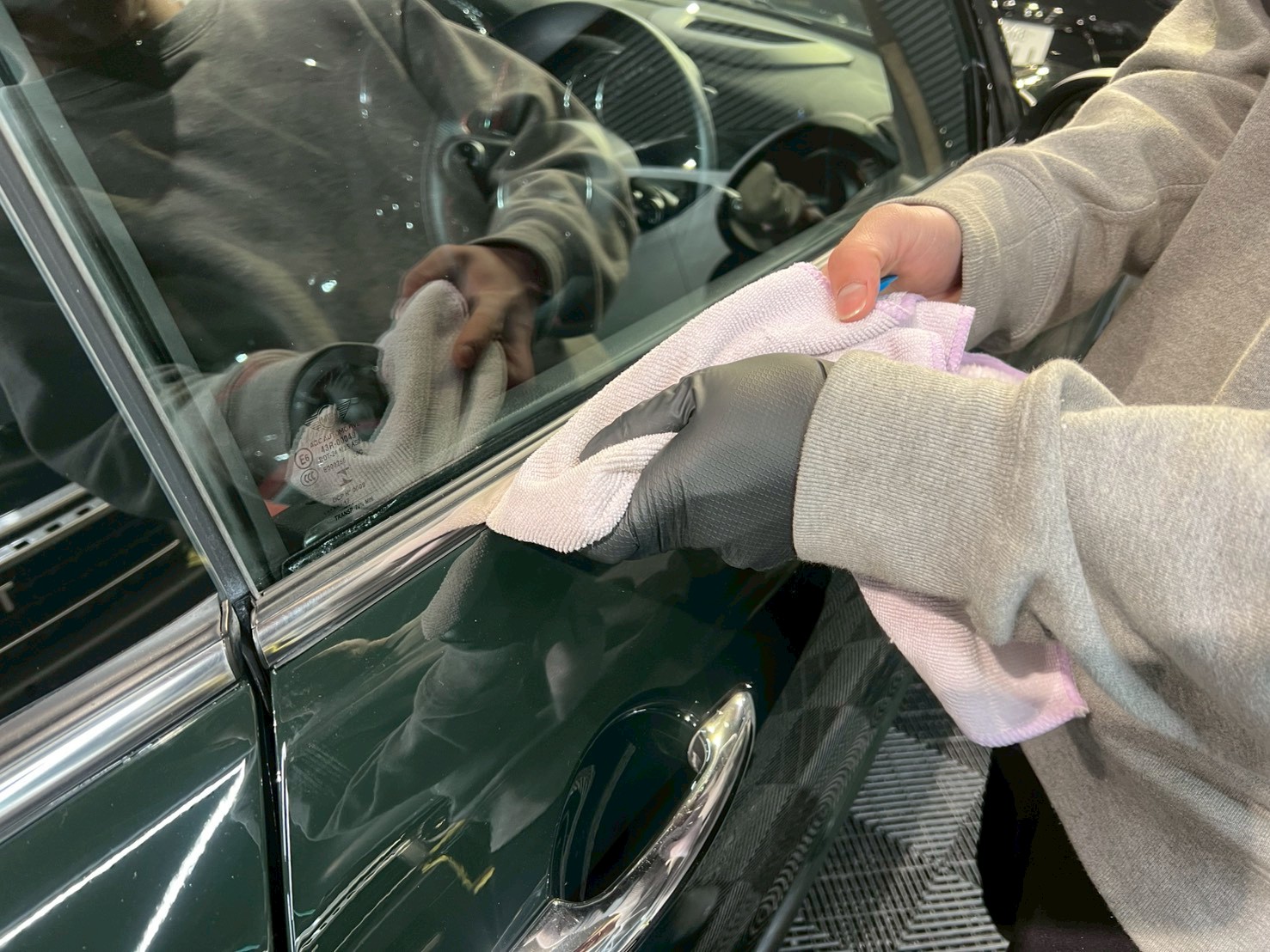 脱脂、仕上げ作業(ドアの内側や隙間の磨き粉の除去、窓清掃、ホイール仕上げ、室内清掃)