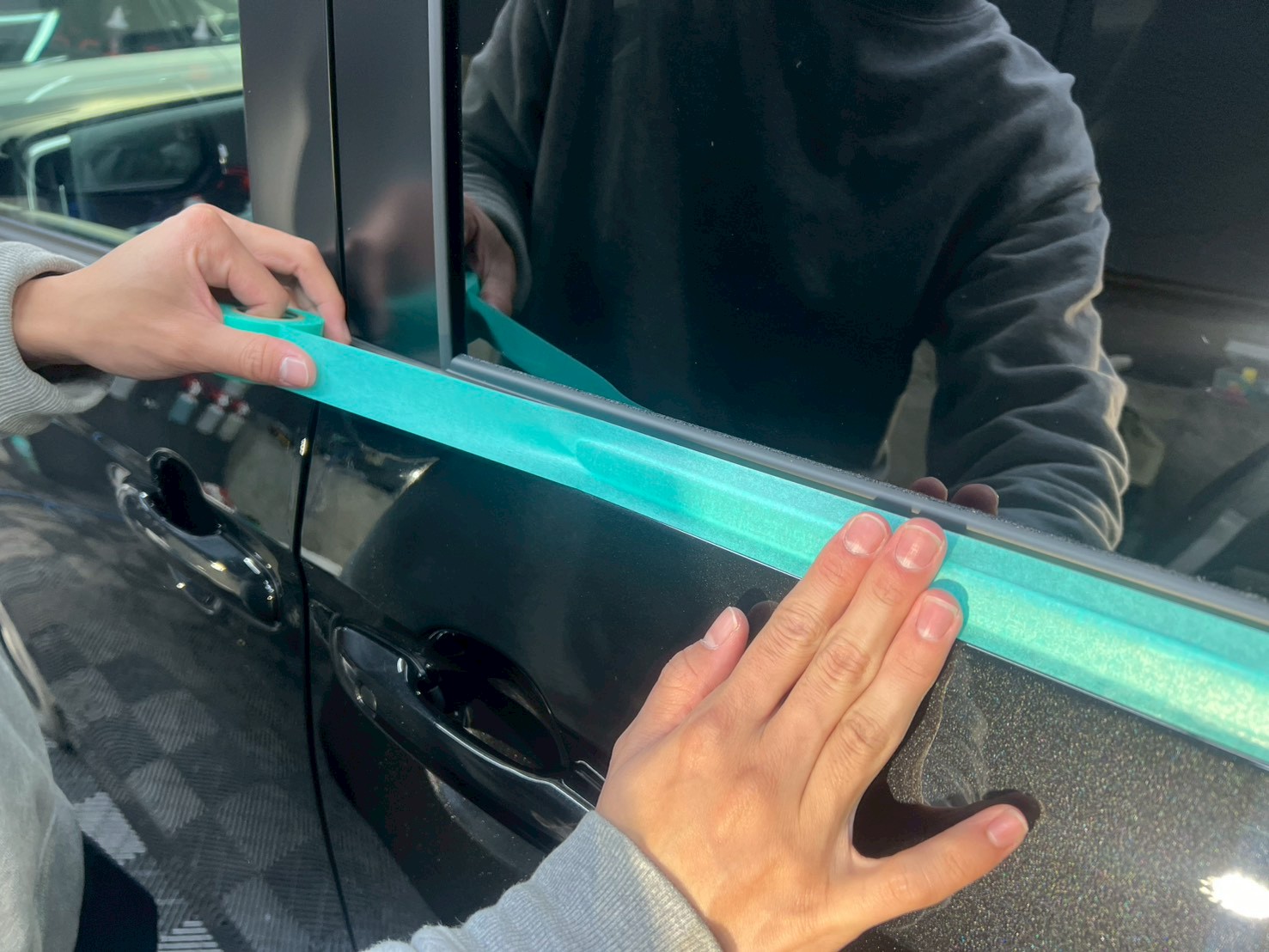 ブロアで水滴を飛ばし、ポリッシャーで磨く際に当たってはいけない箇所、磨き粉の浸入を防ぎたい箇所をマスキングテープで保護していきます。