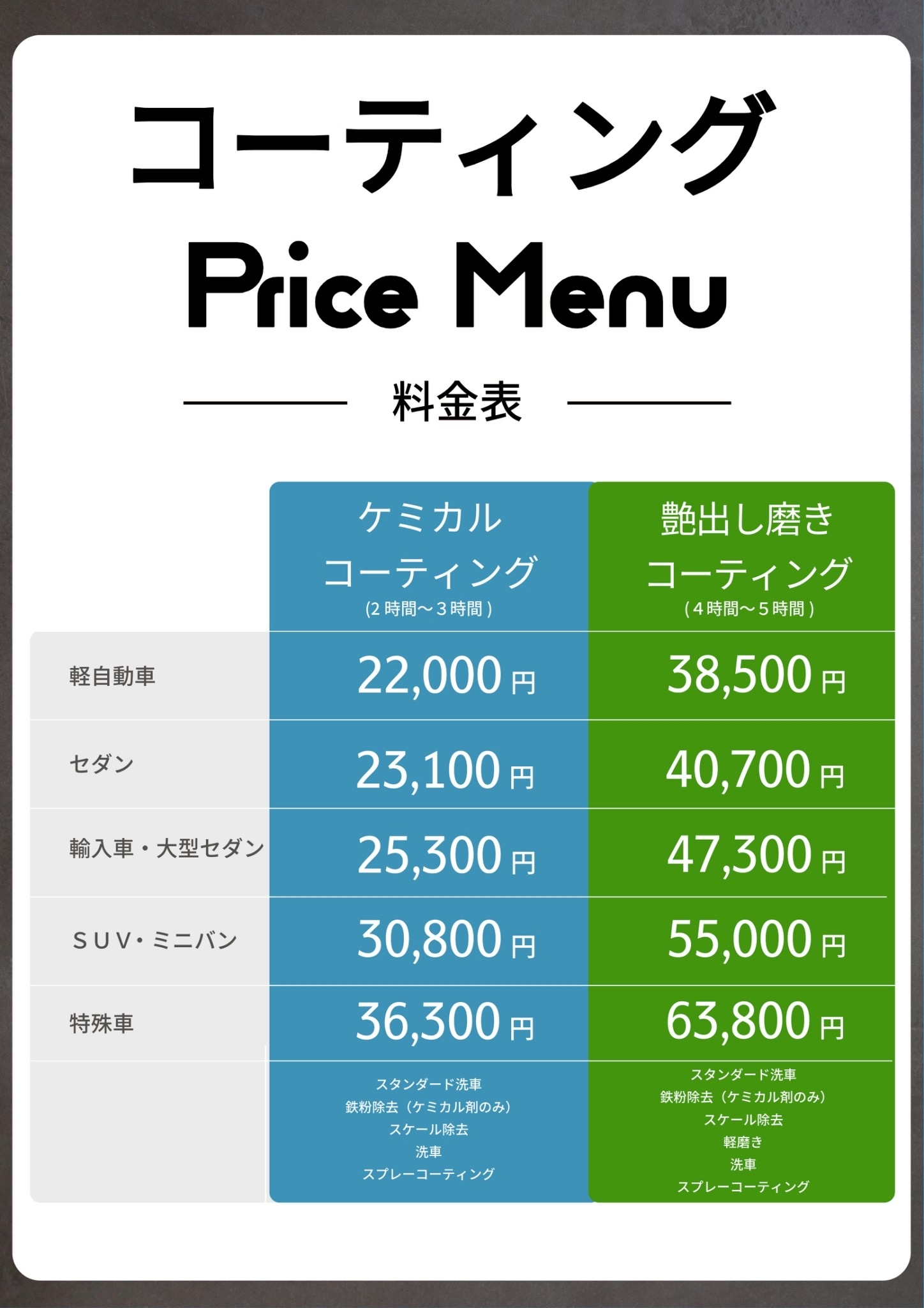 こちらのメニューは、スタンダード洗車をベースとして、ボディ表面をかるく研磨して【艶】を出し、簡易コーティングで保護する