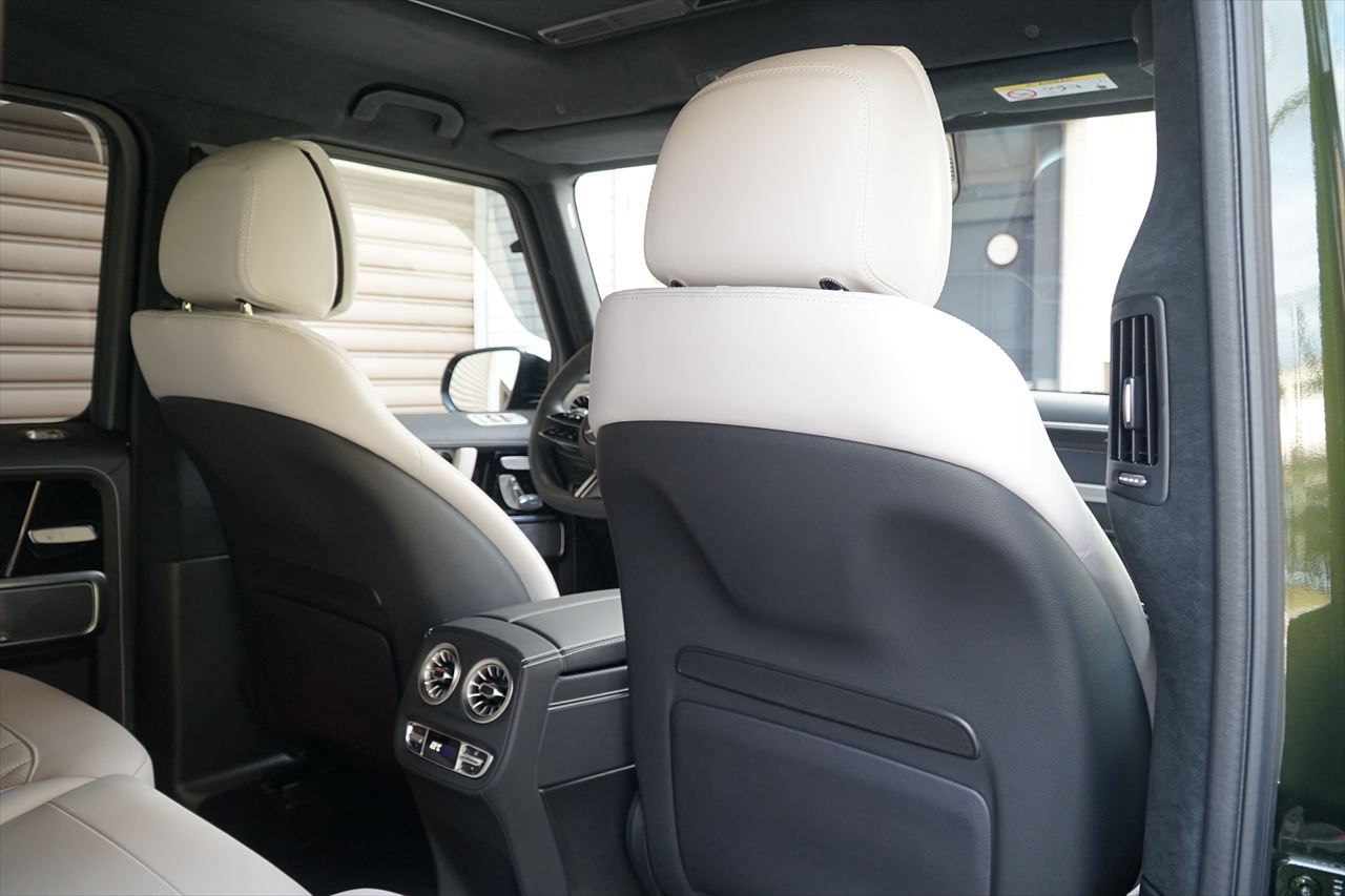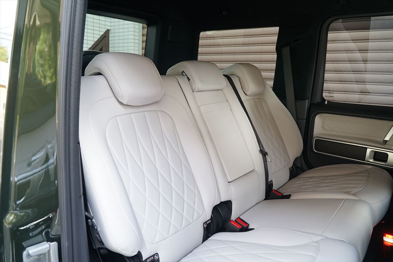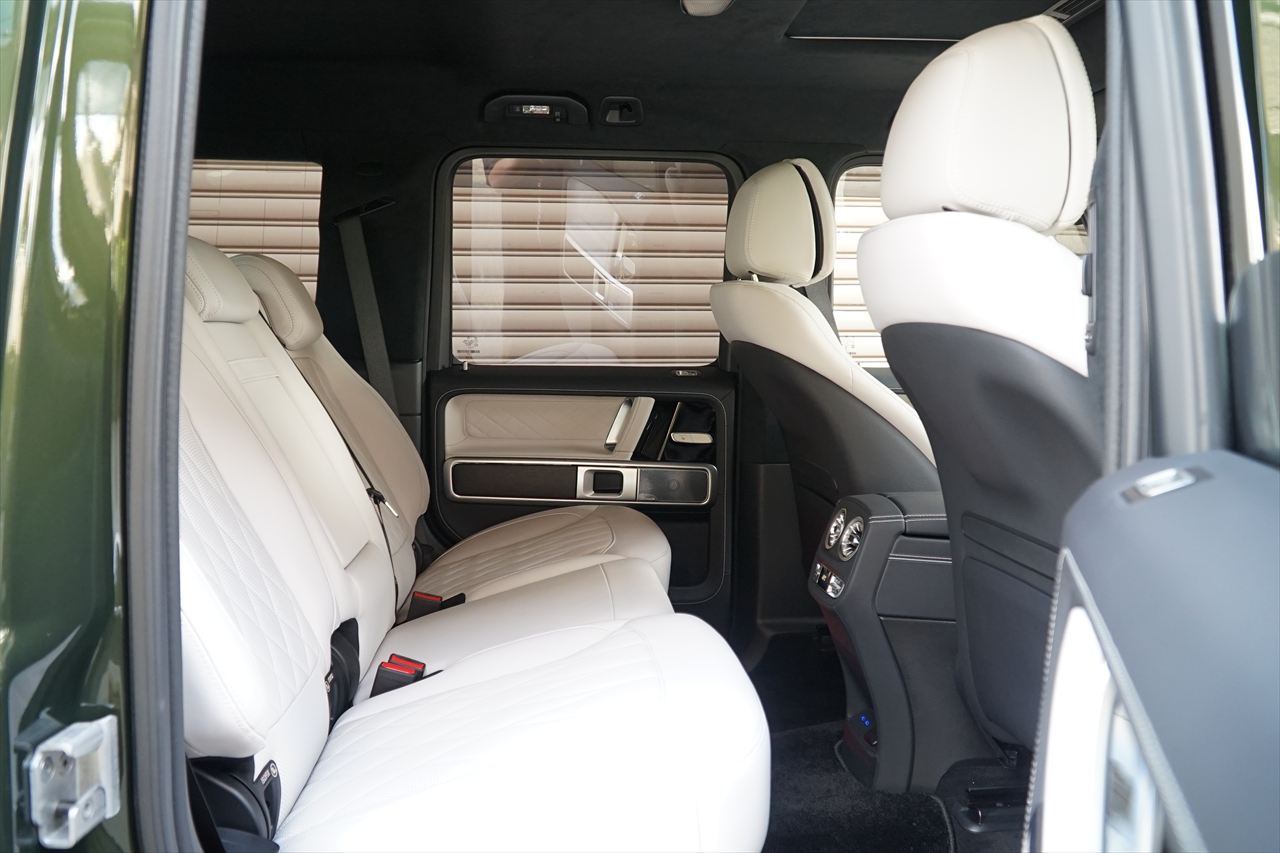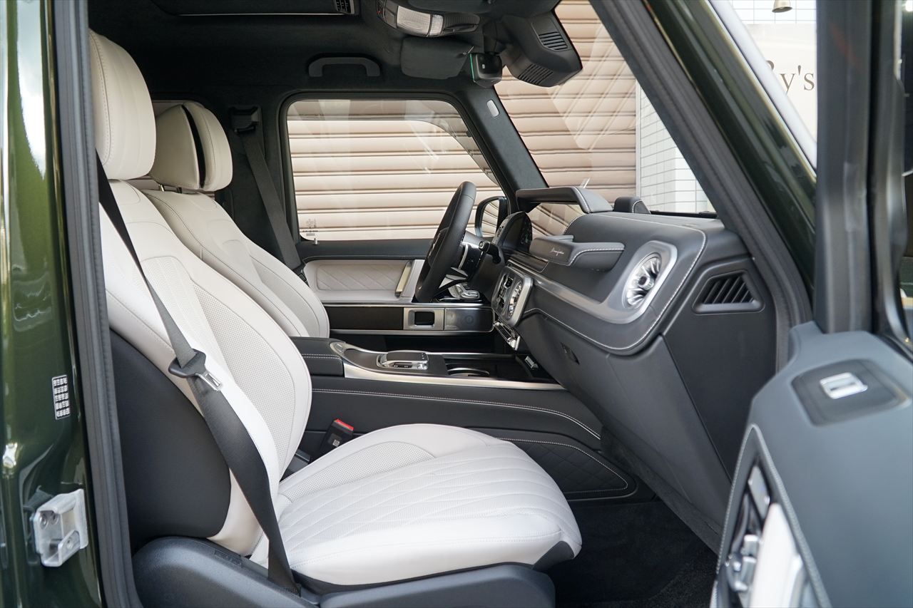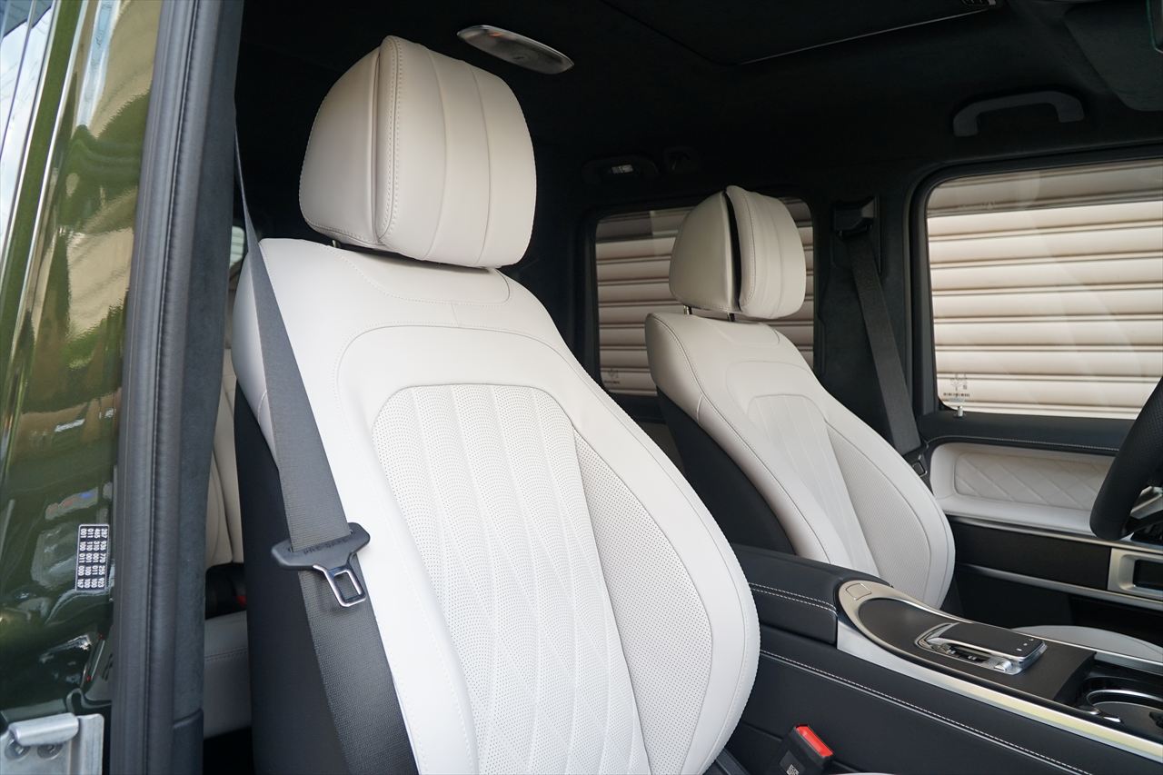 ■マニファクトゥーアオリーブにプラチナホワイトナッパーレザーの組み合わせはGクラスの雰囲気を残しつつラグジュアリーな装いです。
