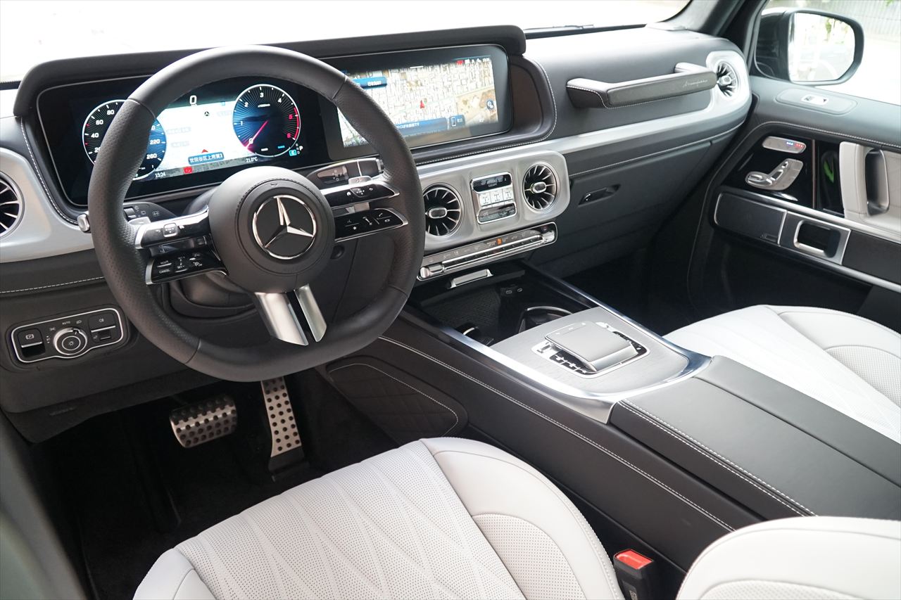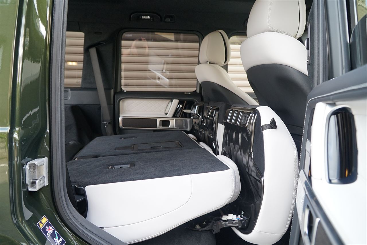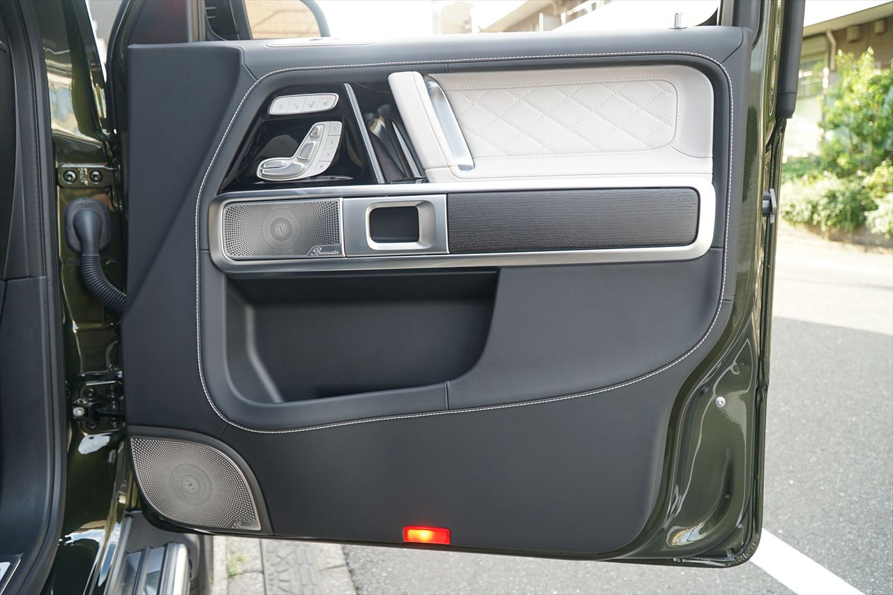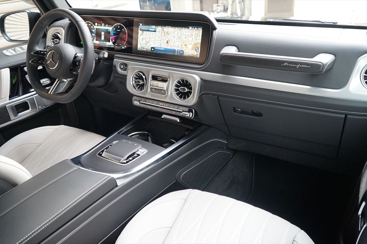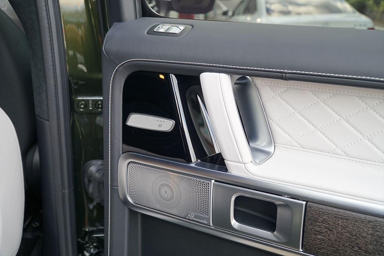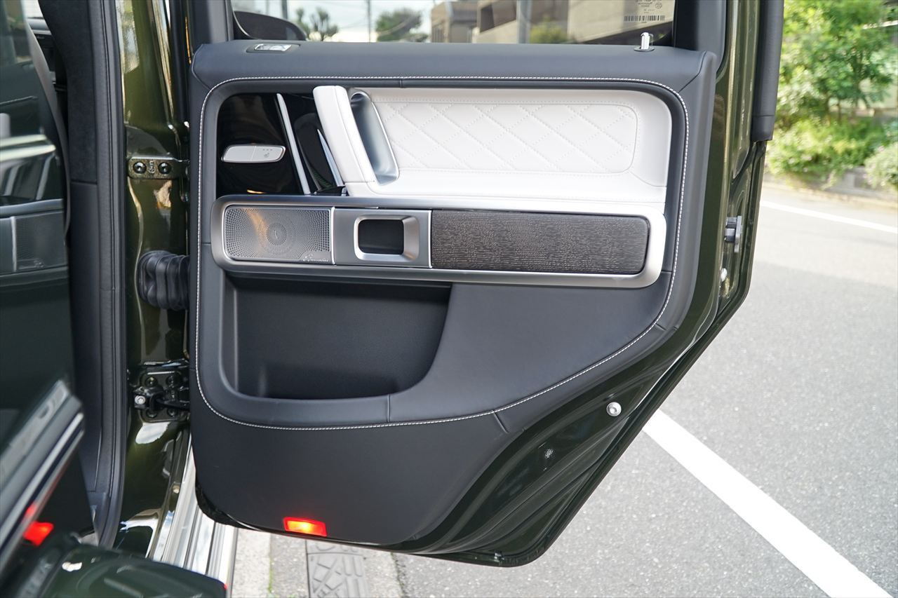 ■マニファクトゥーアオリーブにプラチナホワイトナッパーレザーの組み合わせはGクラスの雰囲気を残しつつラグジュアリーな装いです。