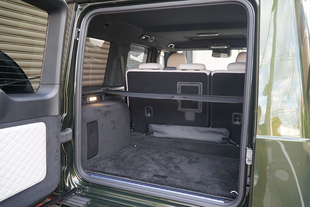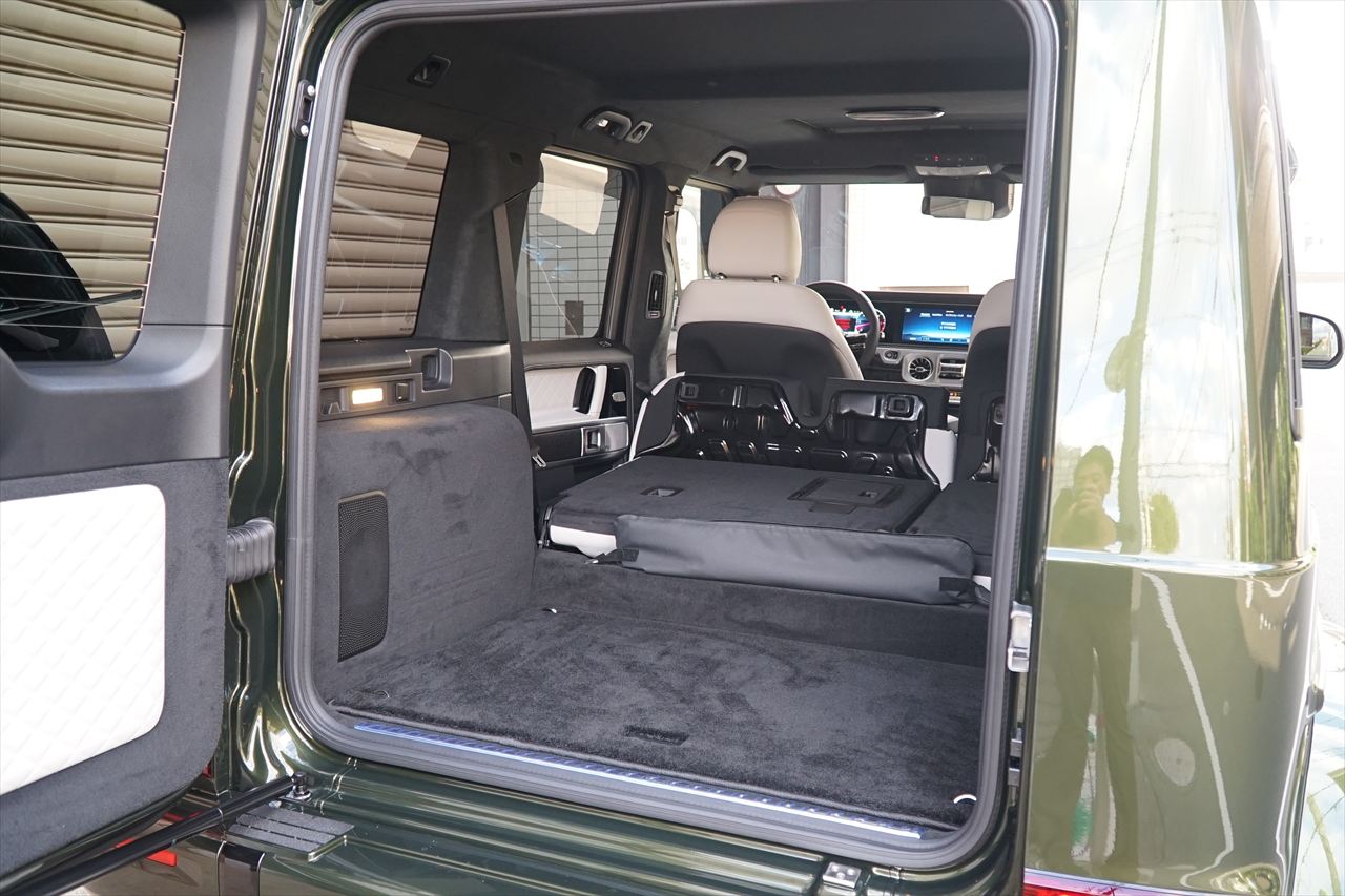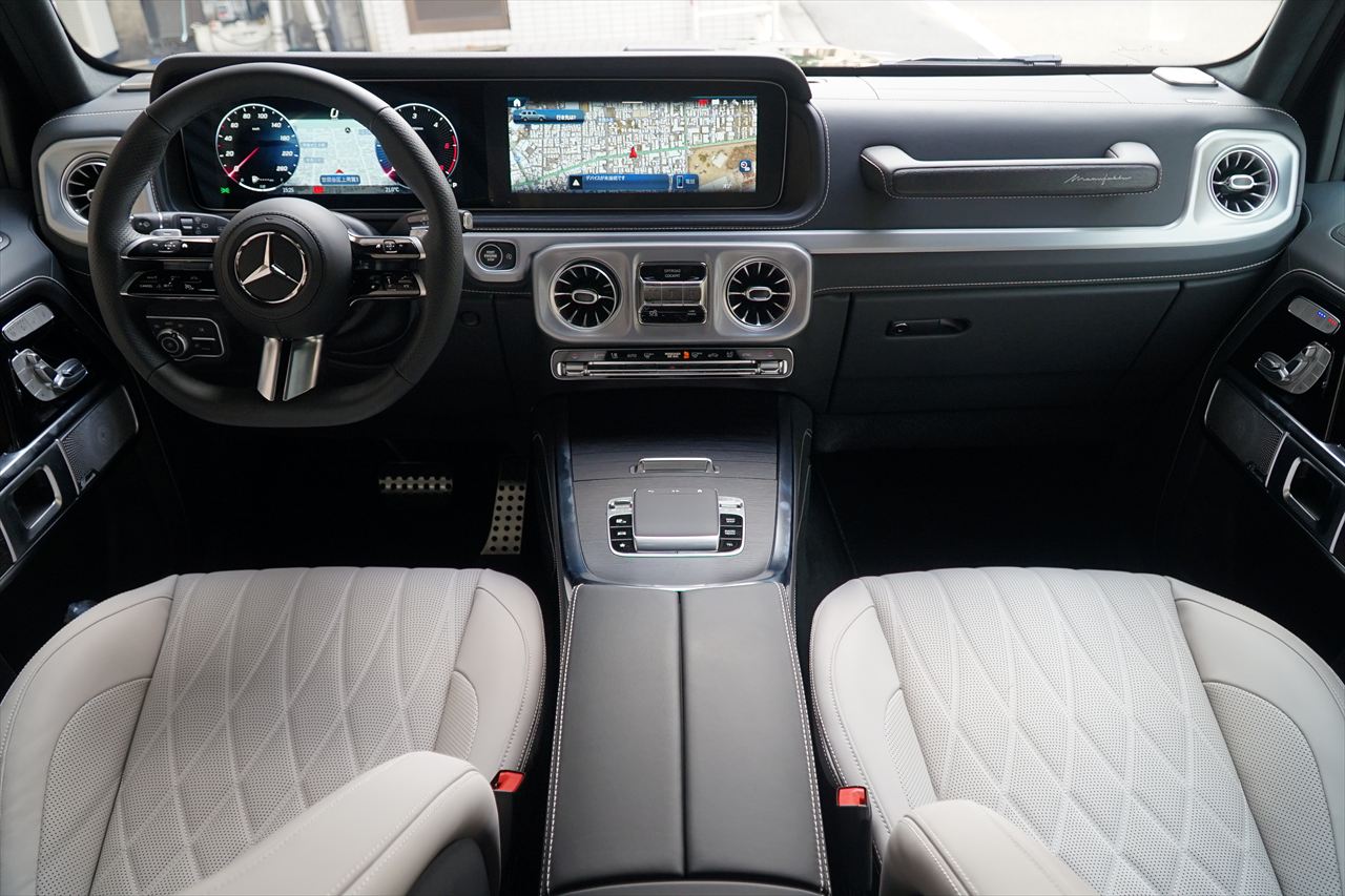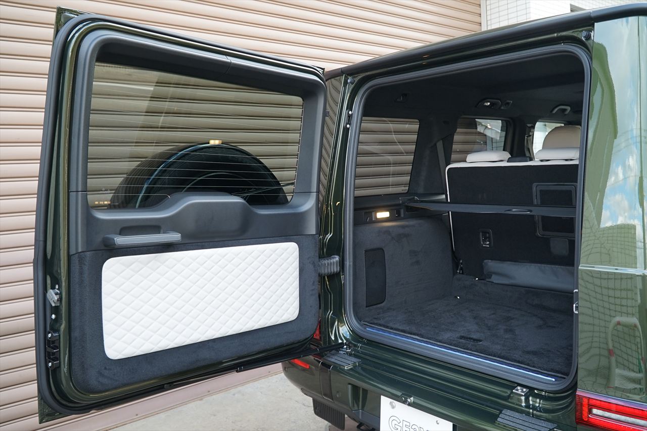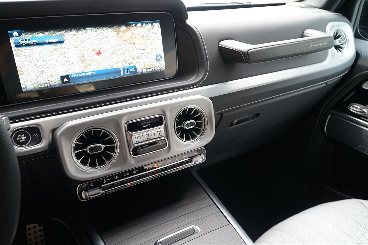 ■マニファクトゥーアオリーブにプラチナホワイトナッパーレザーの組み合わせはGクラスの雰囲気を残しつつラグジュアリーな装いです。