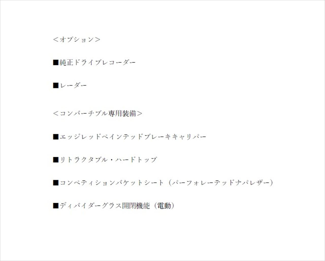 ・Z51パフォーマンスパッケージ(Z51 Brembo 4ピストンキャリパー/大径ブレーキローター/パフォーマンスエギゾースト/パフォーマンスリアアクスルレシオ/電子制御LSD/Z51専用フロントスプリッター&リアスポイラー/強化クーリングシステム/マグネティックセレクティブライドコントロール)