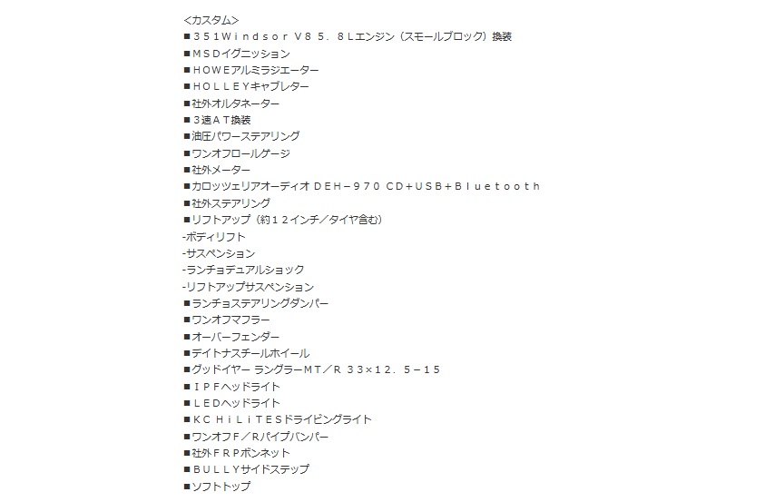 初代SUVとも称されるフォード ブロンコが入庫致しました。本車両はV8・5.8L 351ウィンザーエンジンへ換装されており、スムーズな吹け上がりと迫力あるエキゾーストサウンドが魅力の一台です。3速ATとの組み合わせにより、クラシックカーとは思えないパワフルかつ滑らかな走行性能を実現しています。エクステリアはパイプバンパーやリフトアップを施したワイルドな仕様で、存在感も抜群。59年という長い年月を経た車両ではありますが、現在でもパーツメーカーや専門ショップが多数存在し、補修・メンテナンスパーツも豊富に揃うため、旧車でありながら安心してお乗りいただける環境が整っています。唯一無二の存在感を放つアメリカンクラシックSUV。ぜひこの機会にご検討ください。