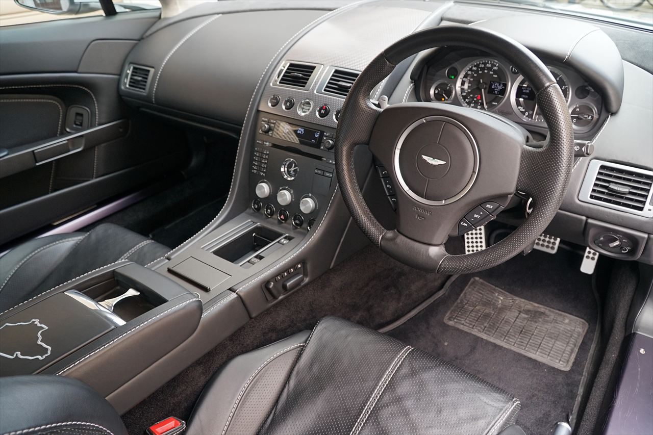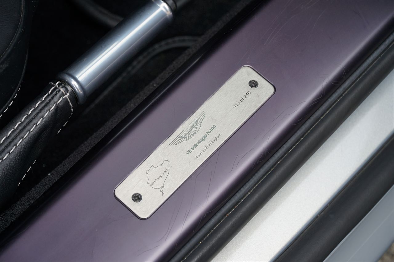 アストンマーティンは2006年インターナショナルADAC24時間レース・ニュルブルクリンクでレース用のN24が4位に入賞しました。その輝かしい成績を記念してこのスペシャルモデル「V8ヴァンテージN400」が240台限定で発売されました。「N」はニュルブルクリンクの「N」、400は馬力の数値となっております。搭載されるベースとなったエンジンは、V8 4.3リッターのノーマルエンジンを排気チューニングにより380PSから400PSへチューニングされており、より官能的なサウンドを奏でます。その他、改良されたビルシュタインダンパーや鍛造アルミホイール、専用サイドシル、マグナムシルバーのボンネット/サイドストレーキメッシュ、ブライトフロントグリル、クリアテールレンズといった専用エクステリアをはじめ、インテリアにもニュルブルクリンク刺繍入りセンターアームレスト、マイクロスピンフィニッシュフェイシアなど特徴的な専用装備が与えられています。エクステリアカラーは伸びやかなデザインを際立たせる「ライトニングシルバー」、インテリアは「オブシディアン」のスポーティな組み合わせです。世界限定240台という希少さで、さらに国内正規ディーラー車は9台の内1台というさらに希少な一台です。気になるお客様はお早めにお問い合わせください!