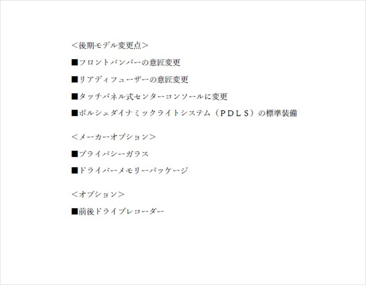 この車両には、2026年6月まで/走行距離無制限のメーカー新車保証がございます。お客様に御納車をさせて頂く前にポルシェ正規ディーラー工場にて新車保証をお客様名義に継承をさせて頂きます。日本全国どこのディーラーでも対応が可能なメーカー新車保証になります。万が一の故障や修理の際にも安心です。ご不明な点、御質問などあれば、お気軽にお申し付けください。