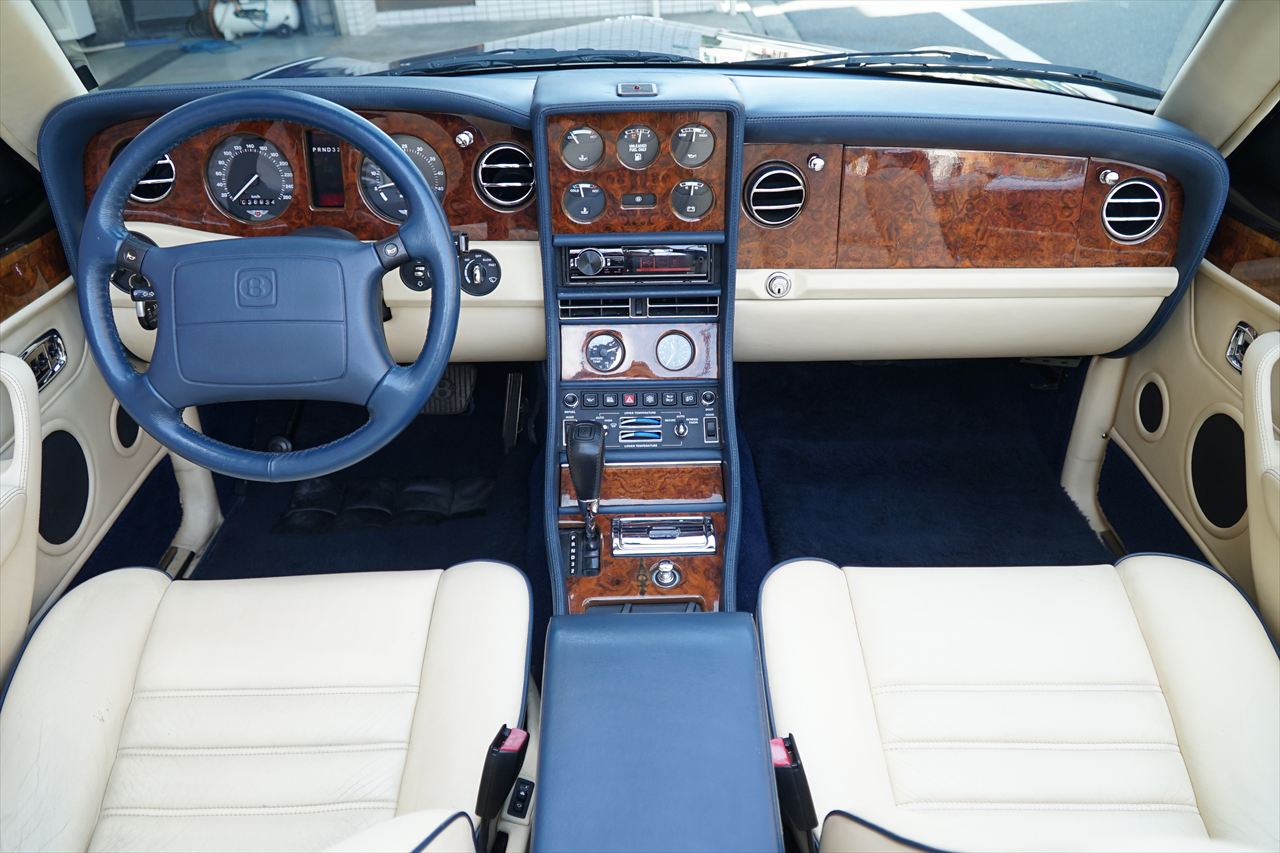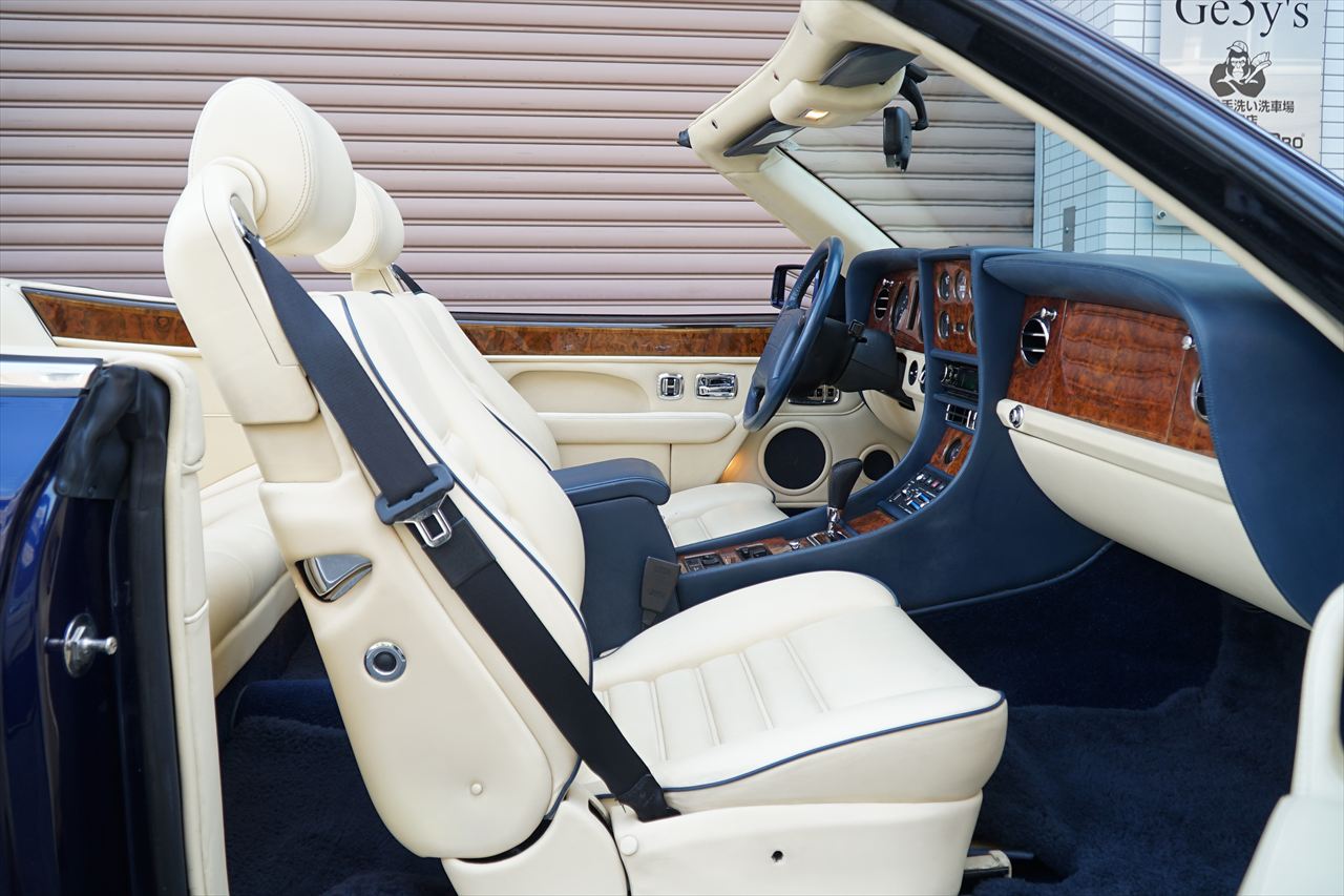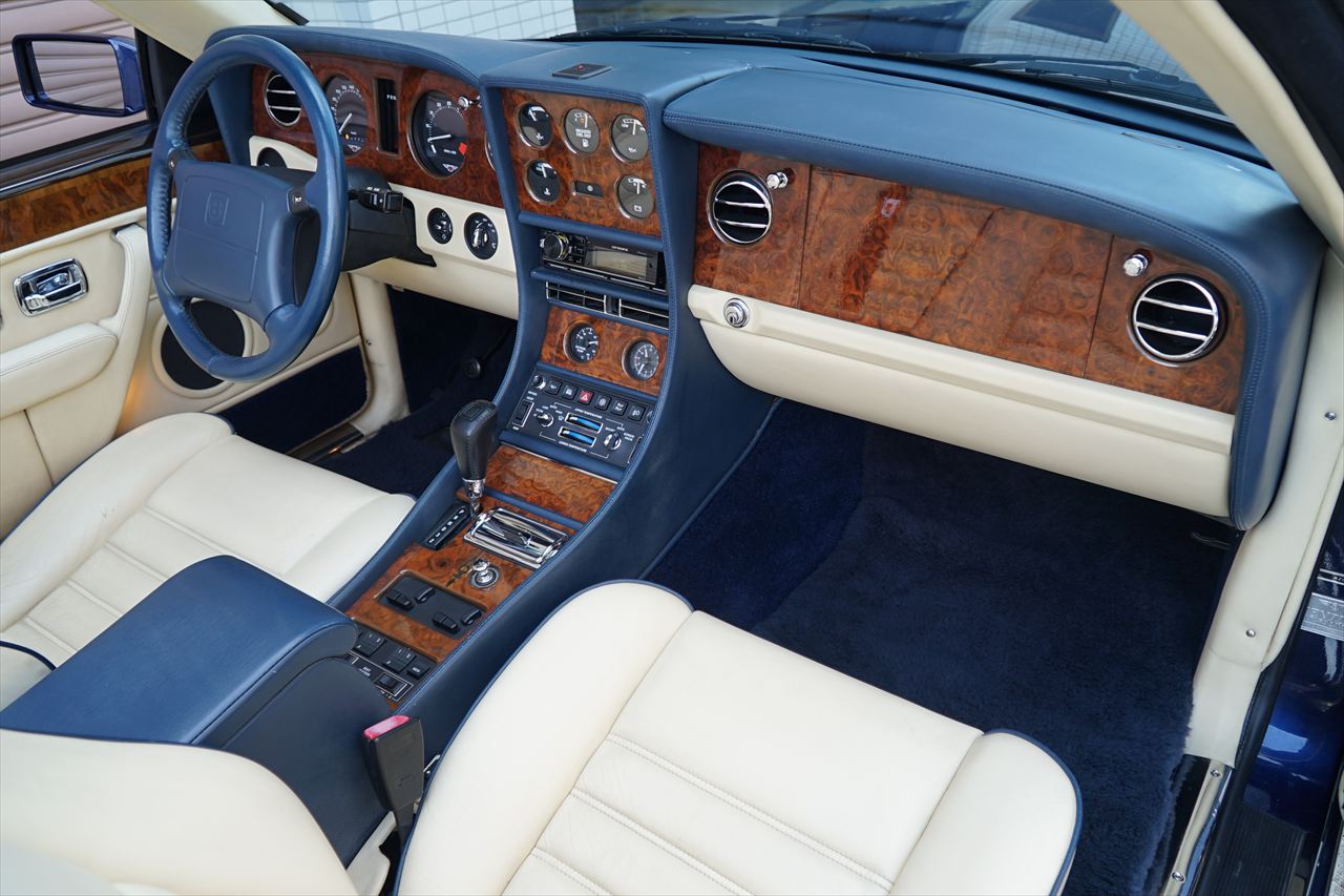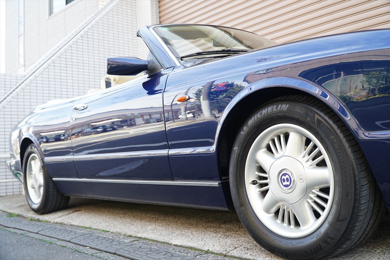 1992年発売のベントレー・ターボRをベースに開発されたクーペ「コンチネンタルR」のオープンモデル、「アズール」が入庫しました。初代アズールは、ボディデザインおよび電動オープントップの開発・製作をイタリアの名門「ピニンファリーナ」が担当。イタリア・トリノのピニンファリーナ工場で幌の製作・装着が行われた後、英国クルーのベントレー工場へ戻され、最終仕上げはロールス・ロイス/ベントレーのコーチビルダー「マリナー・パークウォード」が担当するという、極めて贅沢でコストのかかった生産工程を経たモデルです。ピニンファリーナとマリナー・パークウォード、イタリアとイギリスの名門が共同で手掛けたダブルネームの特別な一台。総生産台数は約1,300台、国内正規ディーラー車はわずか約50台とされる希少車両です。ボディカラーは「ピーコックブルーメタリック」、インテリアはマグノリアハイドのコノリーレザーを採用。ダークブルーとグレーのコンビネーションがシックで気品ある室内空間を演出します。巨匠二社が手掛けた希少な正規ディーラー車。コンディションも抜群の個体です。お探しの方はぜひお問い合わせください。