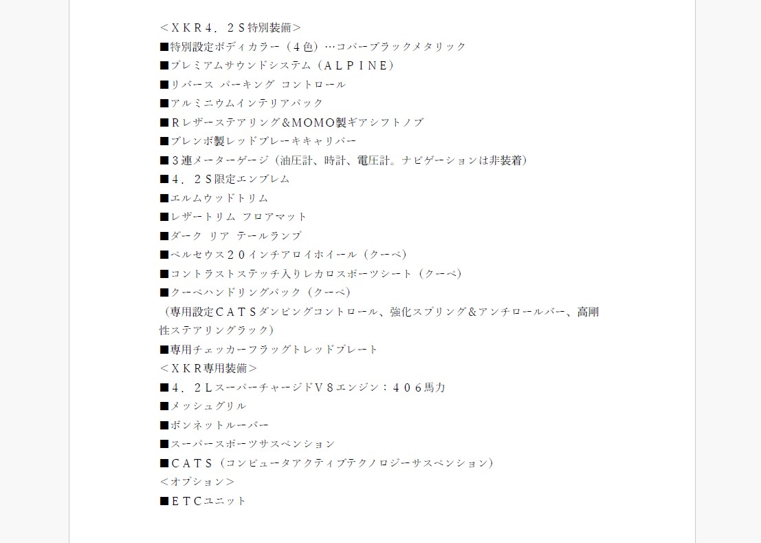 4.2L・V8スーパーチャージド/馬力406PS/トルク56.4Kgm全長479/全幅185/全高129センチ/車両重1,710kg