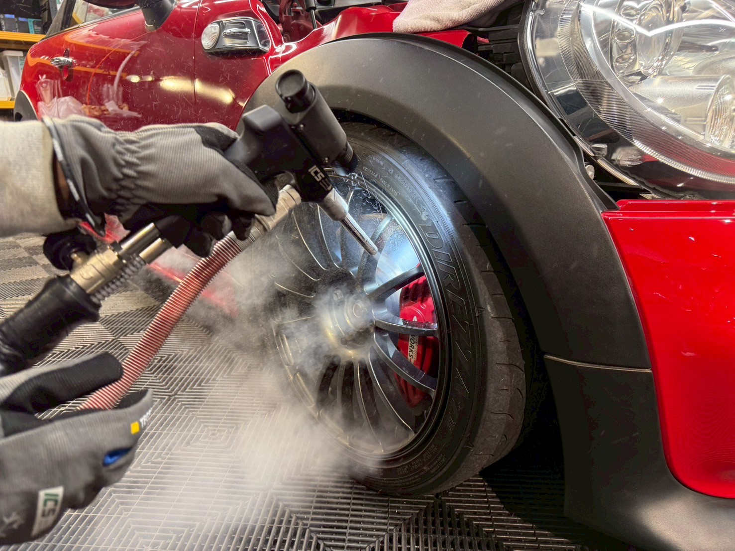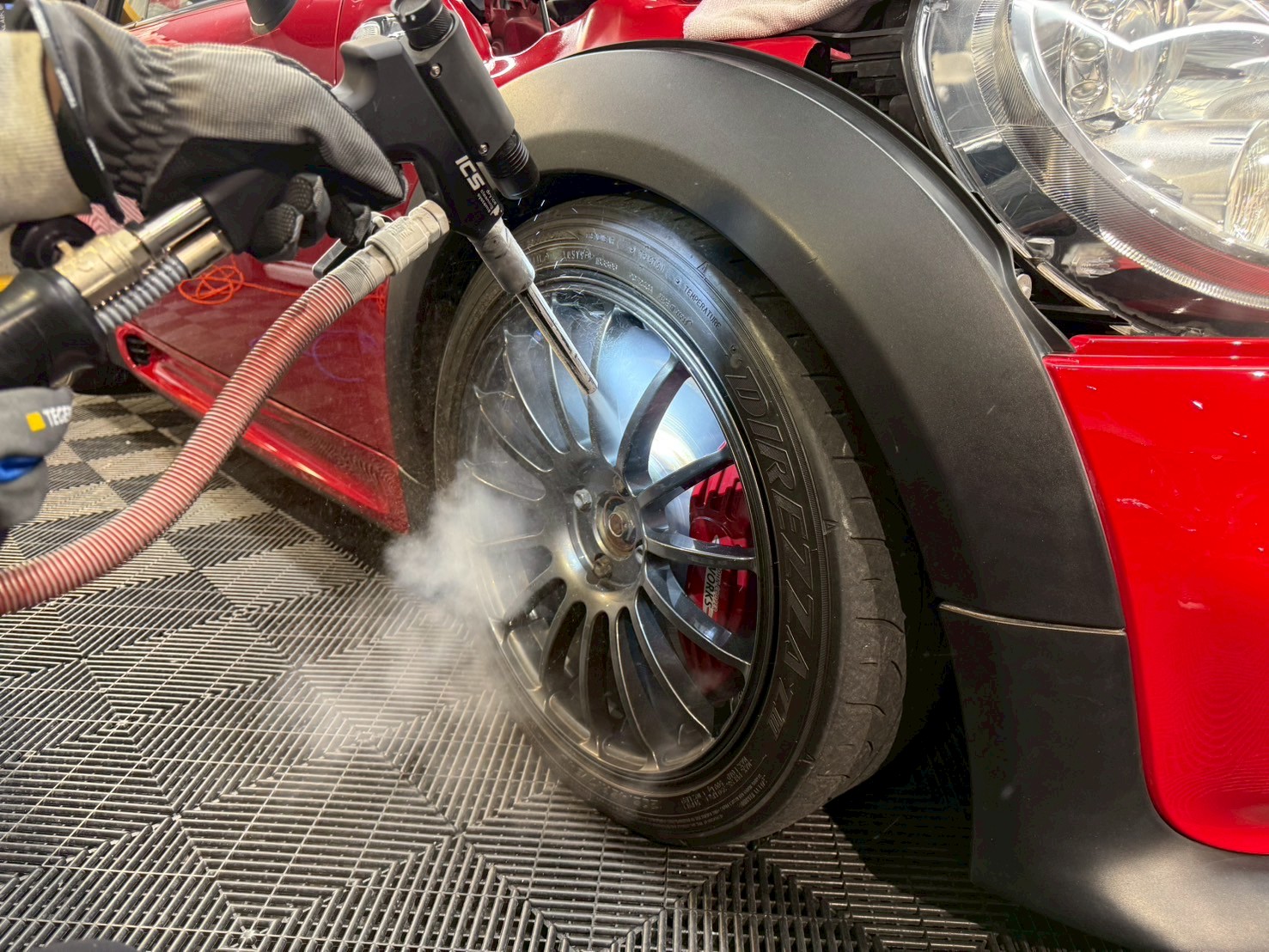 エンジンルーム周りやホイールに頑固な汚れ(オイル・ブレーキダストなど)こうした“触りにくい場所”や“擦ると傷が付きそうな場所”の洗浄に、ドライアイスは特に効果を発揮します。