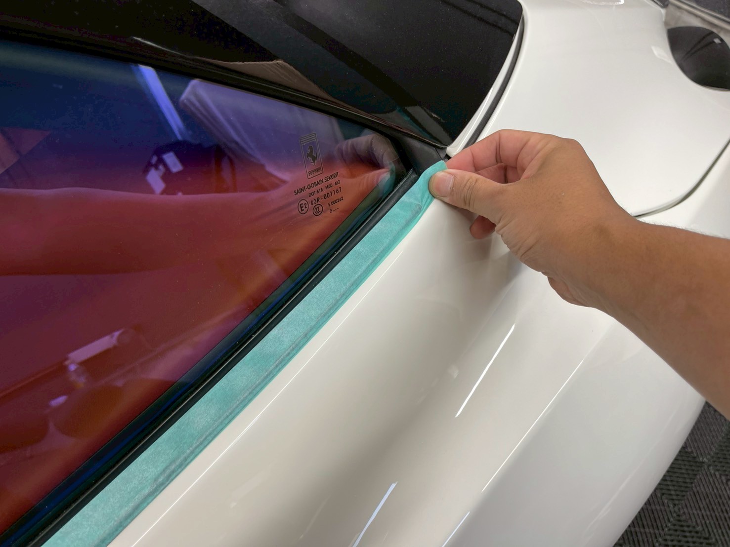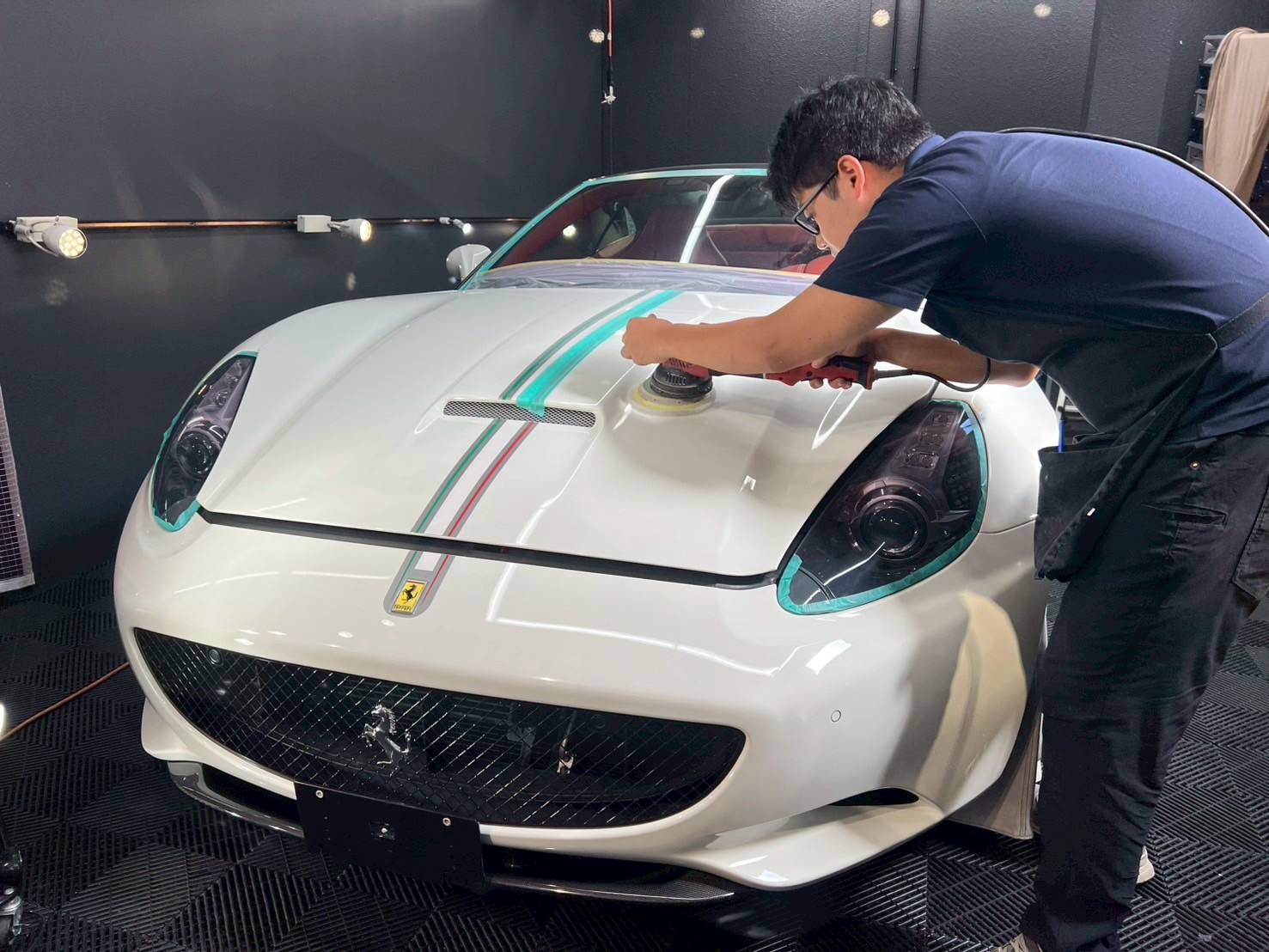 ブロアで水滴を飛ばし、ポリッシャーで磨く際に当たってはいけない箇所、磨き粉の浸入を防ぎたい箇所をマスキングテープで保護していきます。