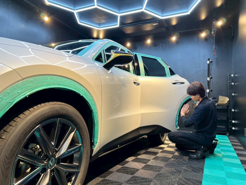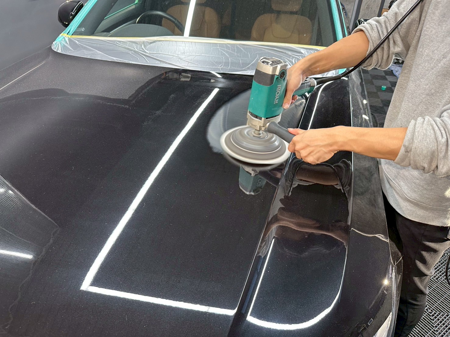 ブロアで水滴を飛ばし、ポリッシャーで磨く際に当たってはいけない箇所、磨き粉の浸入を防ぎたい箇所をマスキングテープで保護していきます。