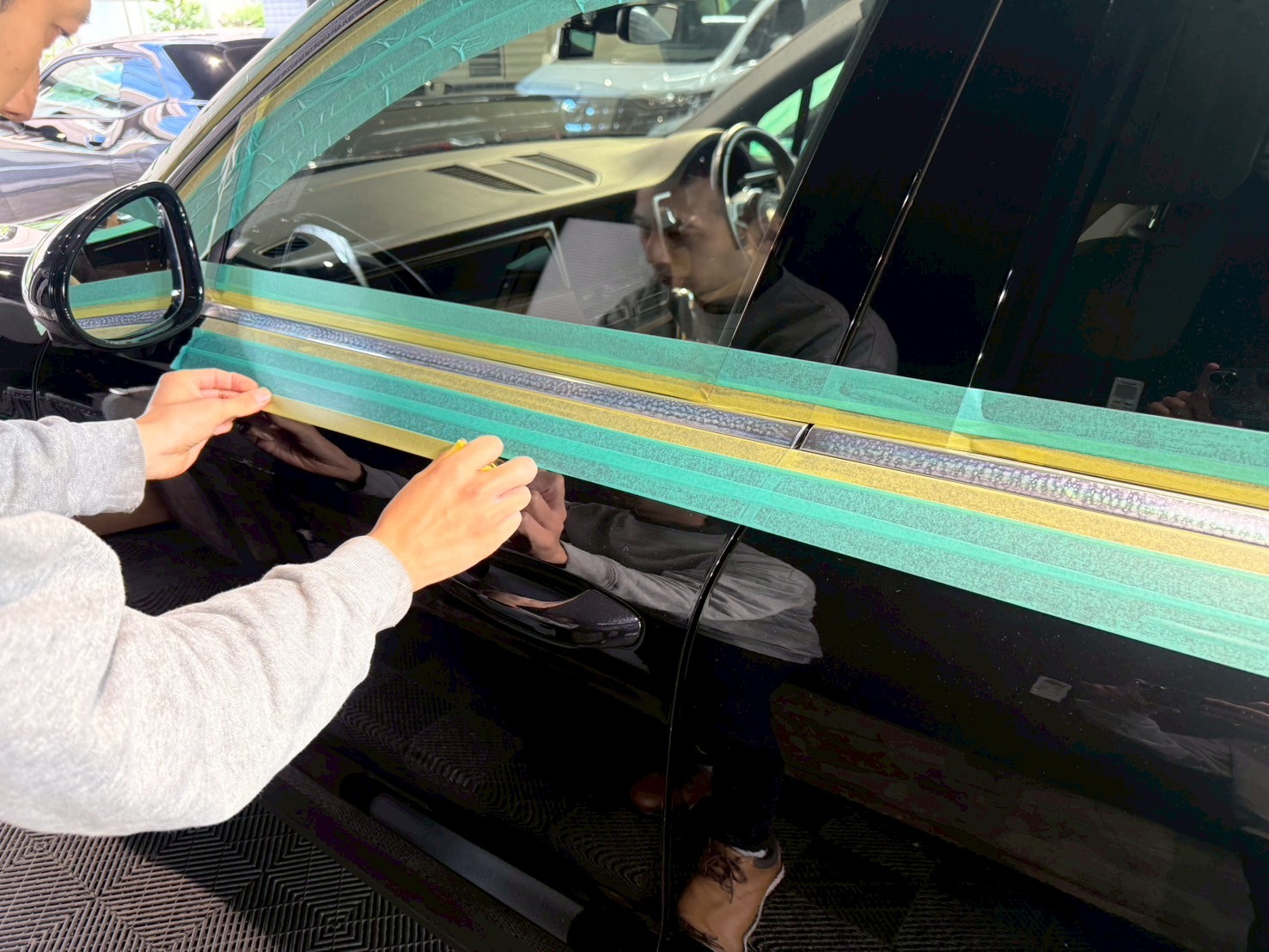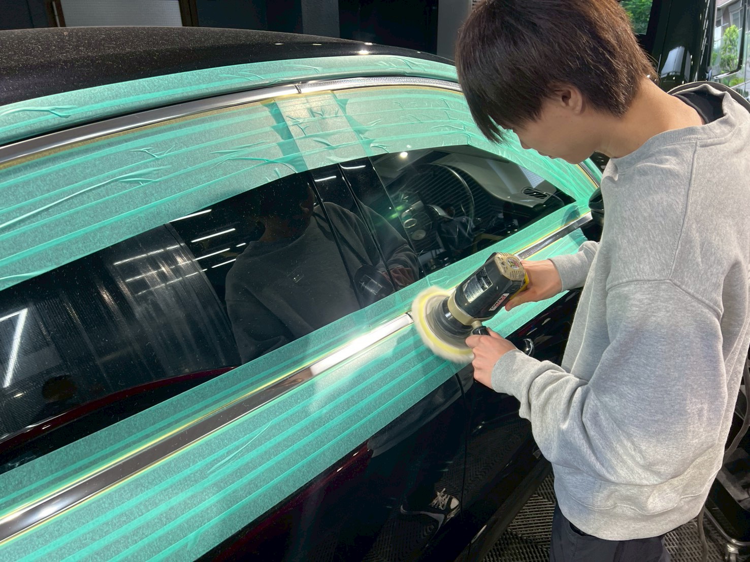 ブロアで水滴を飛ばし、ポリッシャーで磨く際に当たってはいけない箇所、磨き粉の浸入を防ぎたい箇所をマスキングテープで保護していきます。