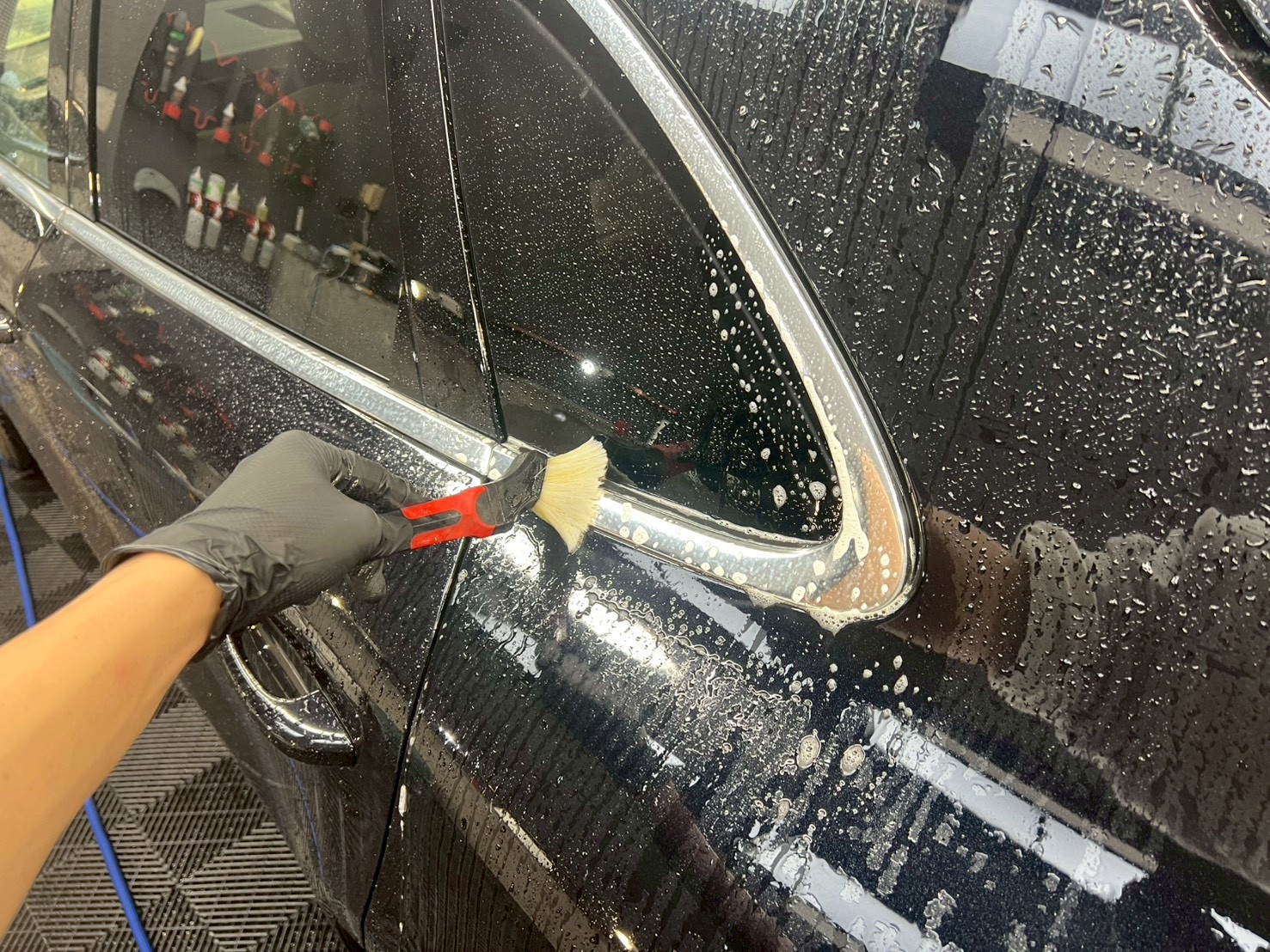 まずは、ボディ洗車、ドアヒンジのクリーニング、ケミカル剤によるクリーニングをしていきます。