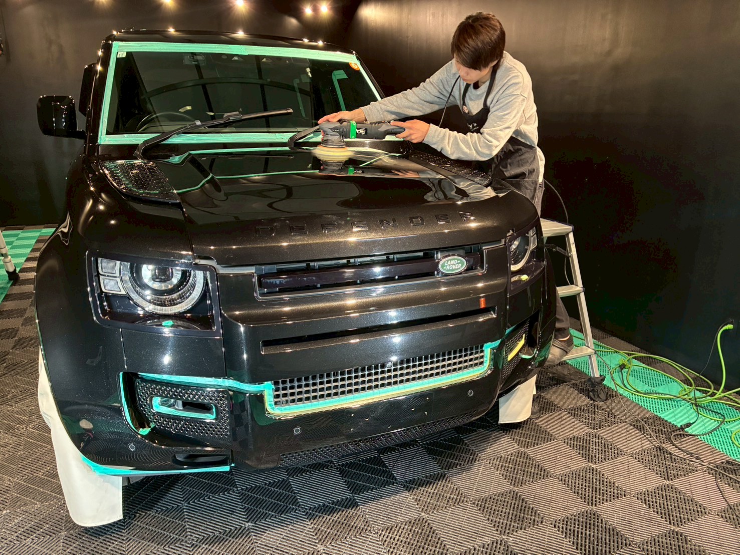 ブロアで水滴を飛ばし、ポリッシャーで磨く際に当たってはいけない箇所、磨き粉の浸入を防ぎたい箇所をマスキングテープで保護していきます。