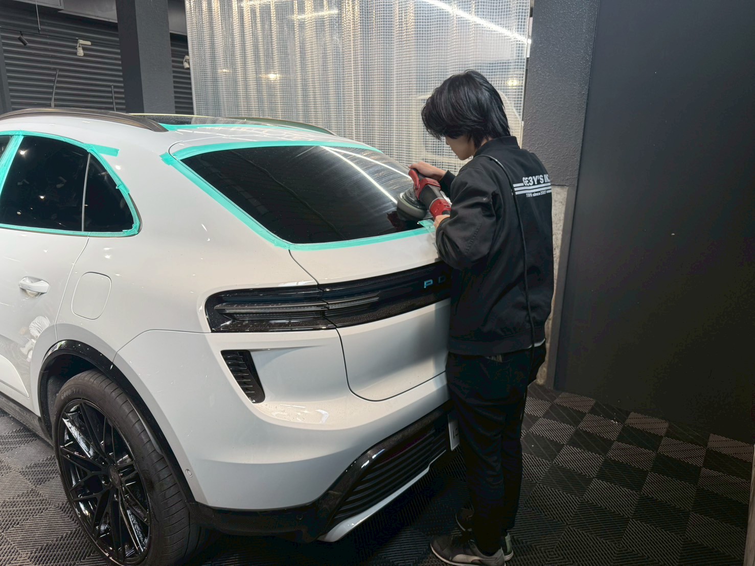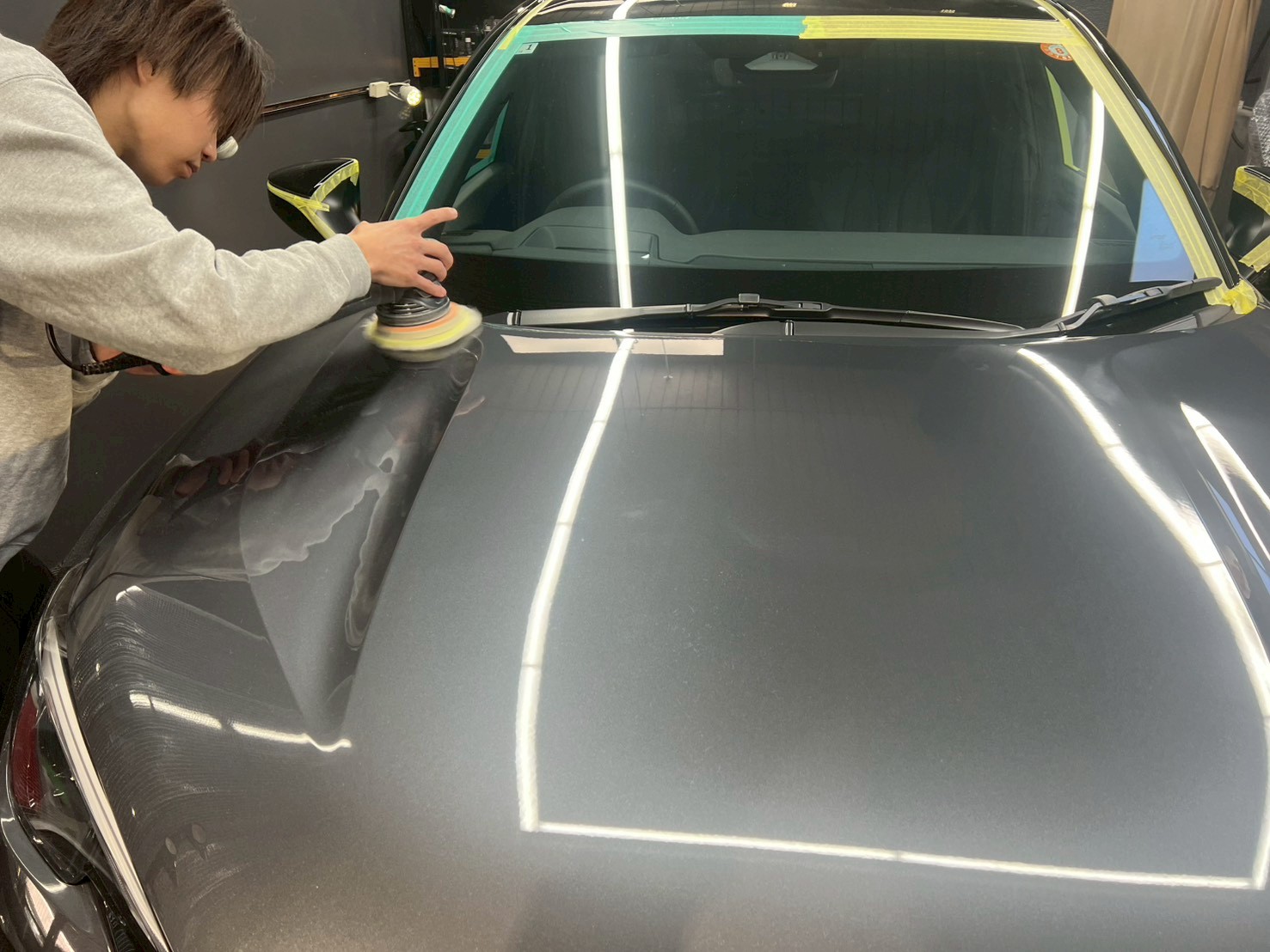 ブロアで水滴を飛ばし、ポリッシャーで磨く際に当たってはいけない箇所、磨き粉の浸入を防ぎたい箇所をマスキングテープで保護していきます。