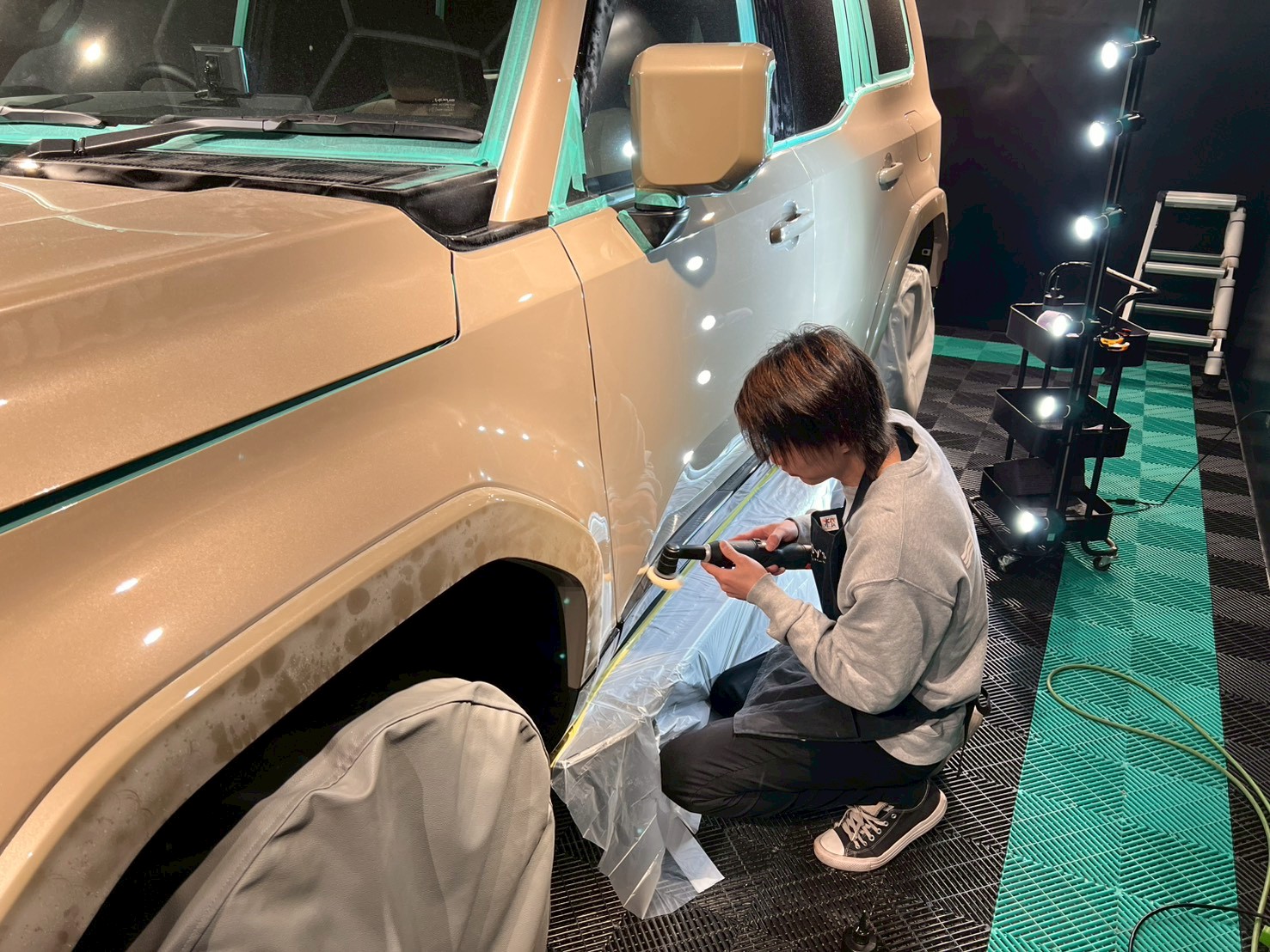 ブロアで水滴を飛ばし、ポリッシャーで磨く際に当たってはいけない箇所、磨き粉の浸入を防ぎたい箇所をマスキングテープで保護していきます。