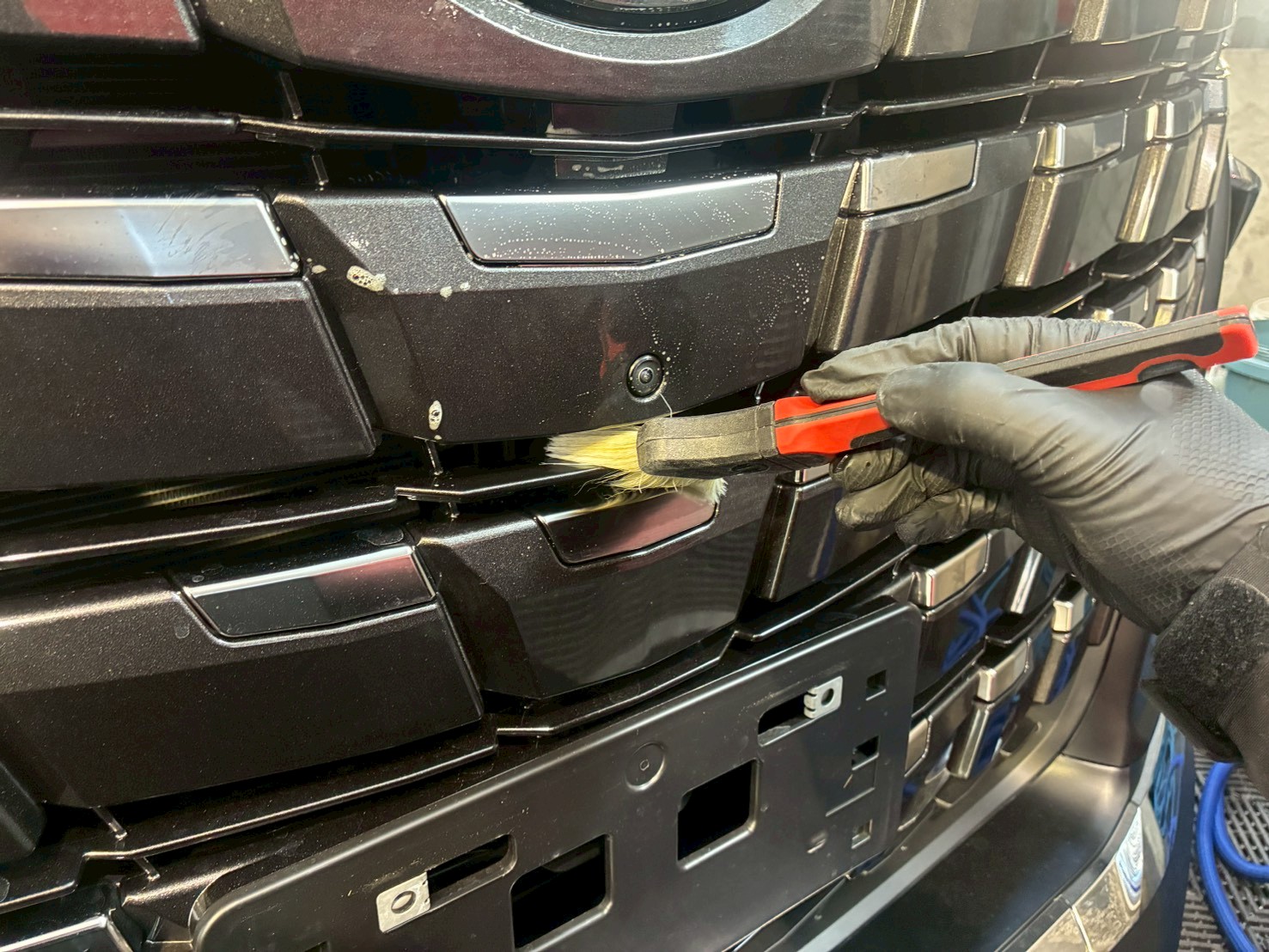 フロントグリルにも、蓄積されたシミ汚れがございましたのでブラシを使い分けながら綺麗にしていきます♪