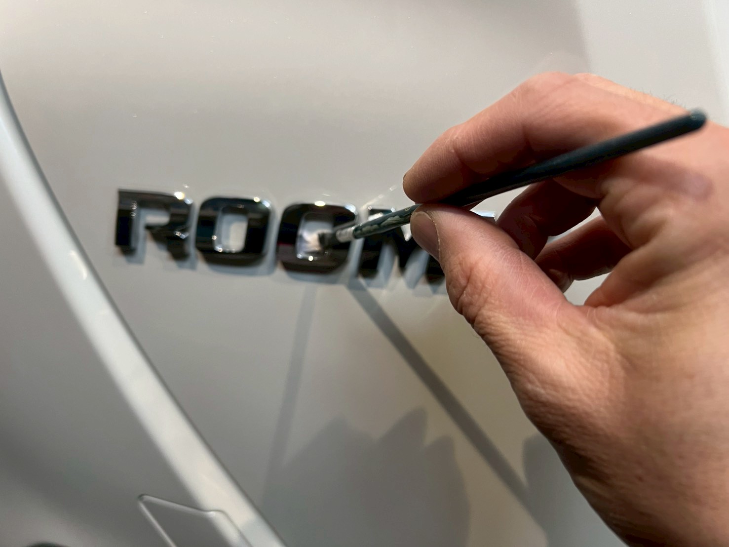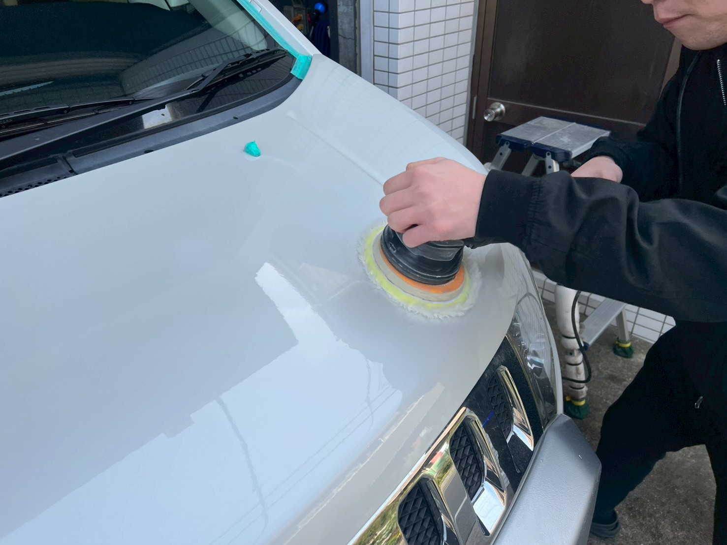 ブロアで水滴を飛ばし、ポリッシャーで磨く際に当たってはいけない箇所、磨き粉の浸入を防ぎたい箇所をマスキングテープで保護していきます。