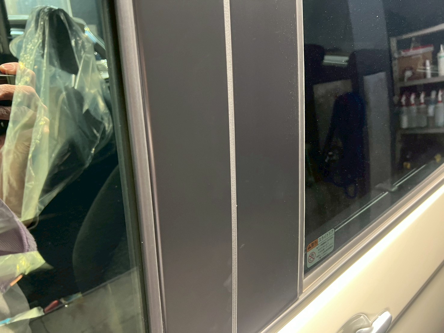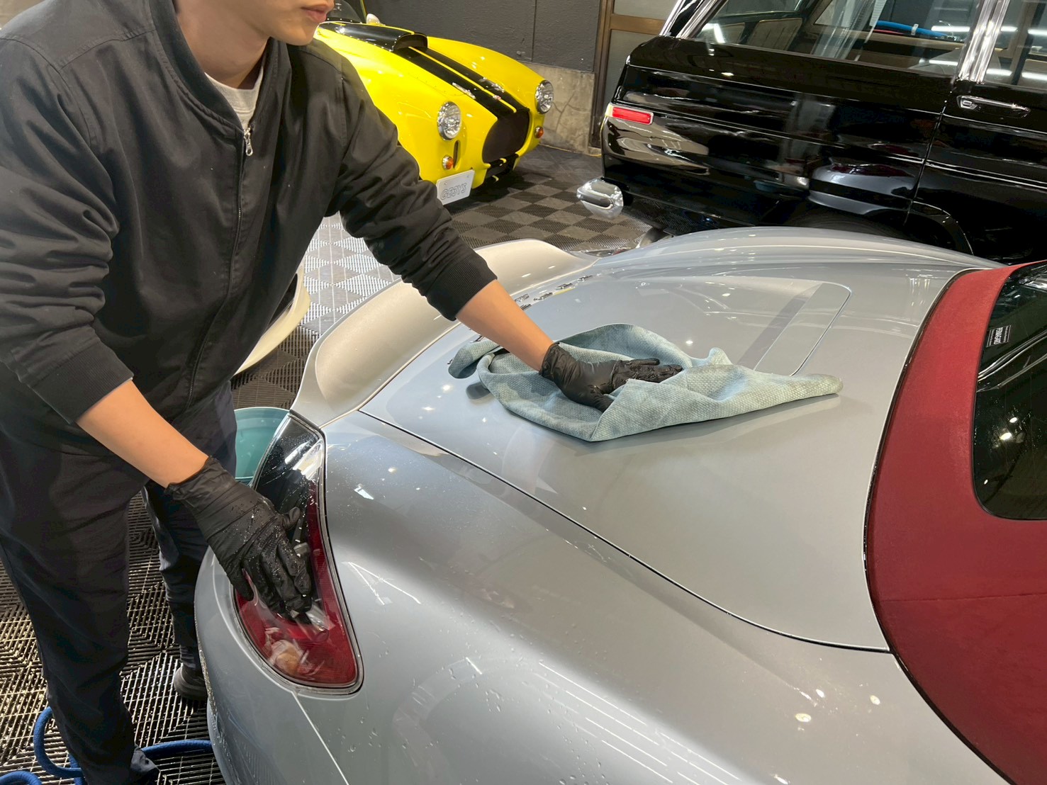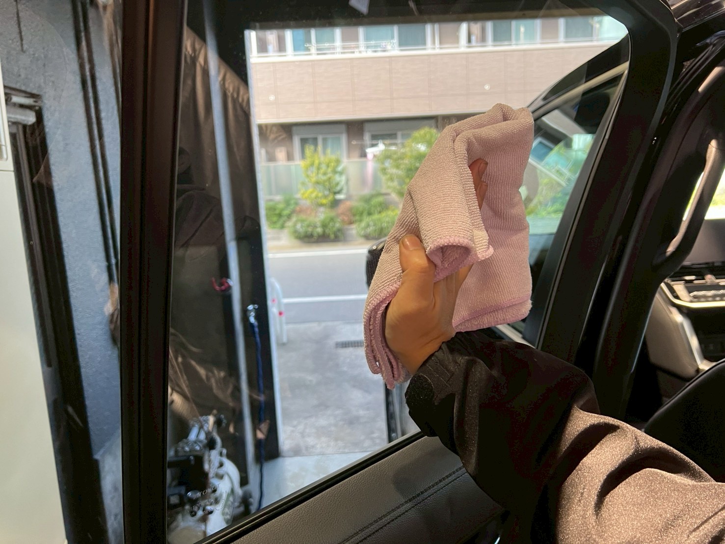 仕上げ作業(ドア内の水滴除去、窓清掃、ホイール仕上げ、室内清掃)
