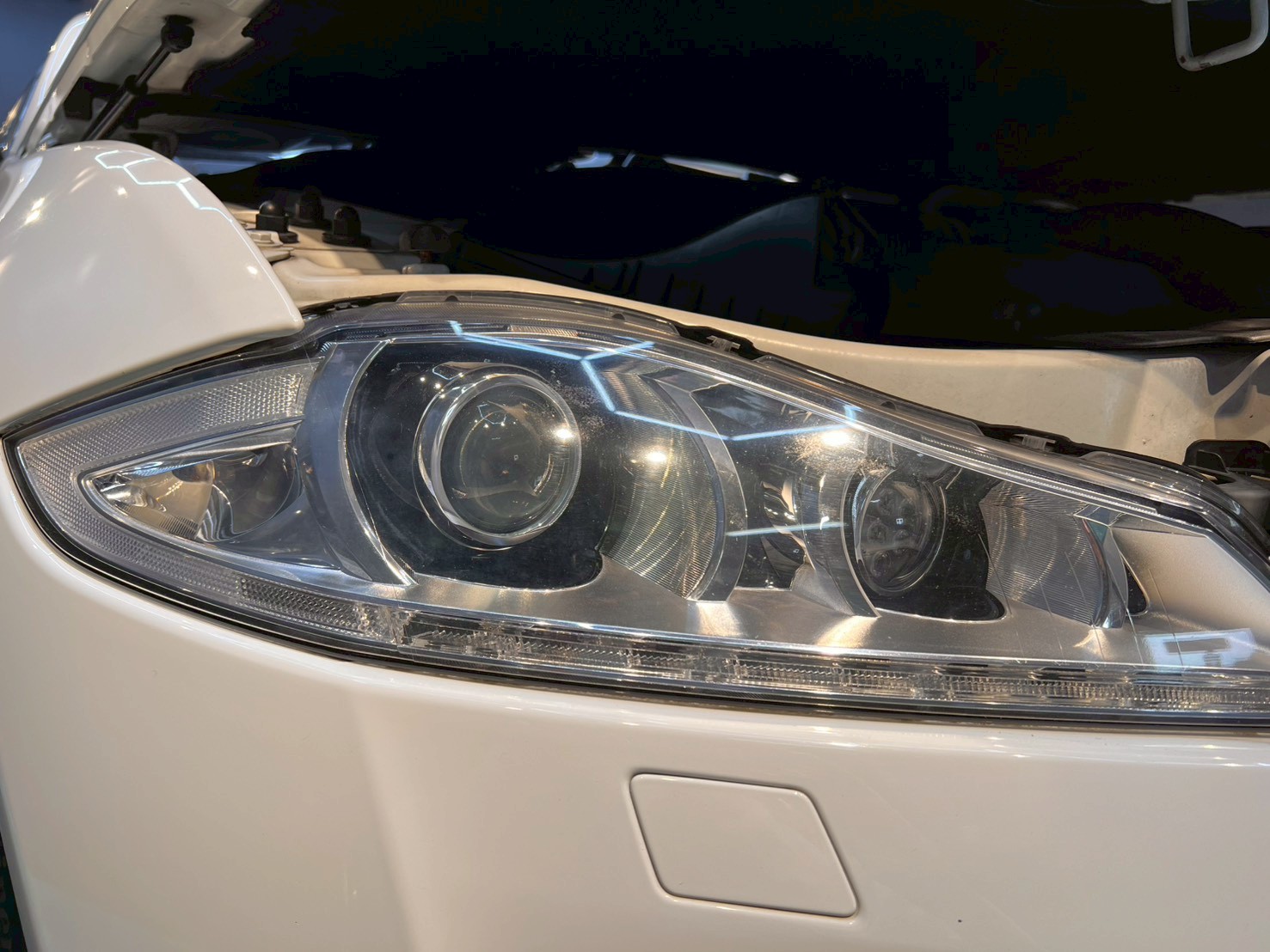 コーティング前には、まず洗車・鉄粉除去・細部洗浄を行い、塗装表面の状態を丁寧に確認します。ジャガーXJの塗装は柔らかさと深みが特徴的なため、研磨では塗装を削りすぎないこと、そして艶をしっかり引き出すことを重視。