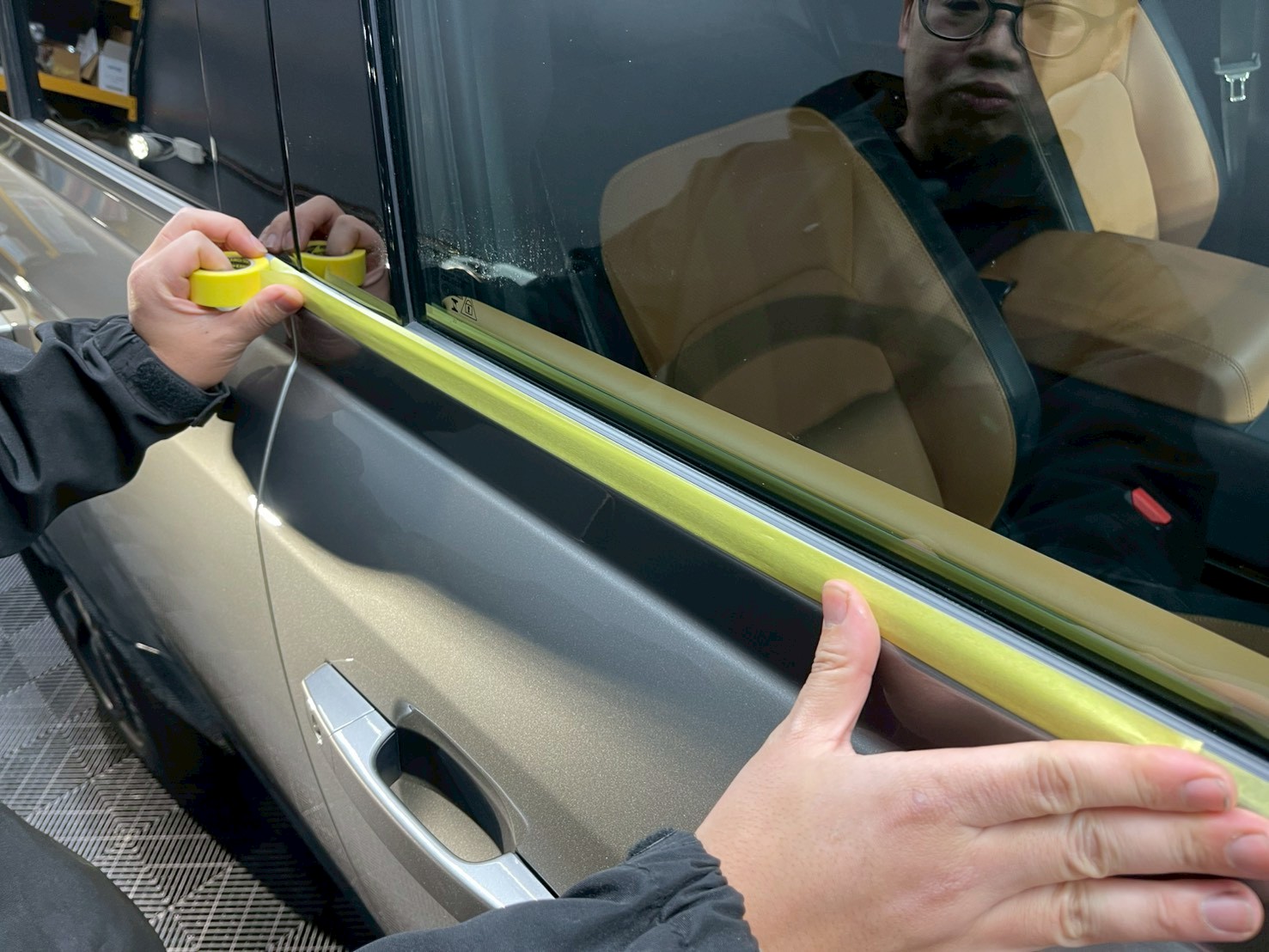洗車が終わりましたら、施工する箇所の周りをマスキングで保護していきます。