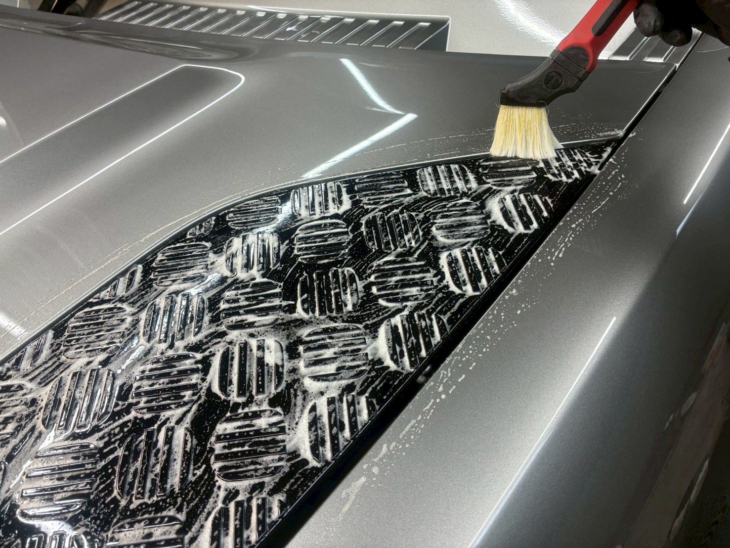 まずは、ボディ洗車、ドアヒンジのクリーニング、ケミカル剤によるクリーニングをしていきます。
