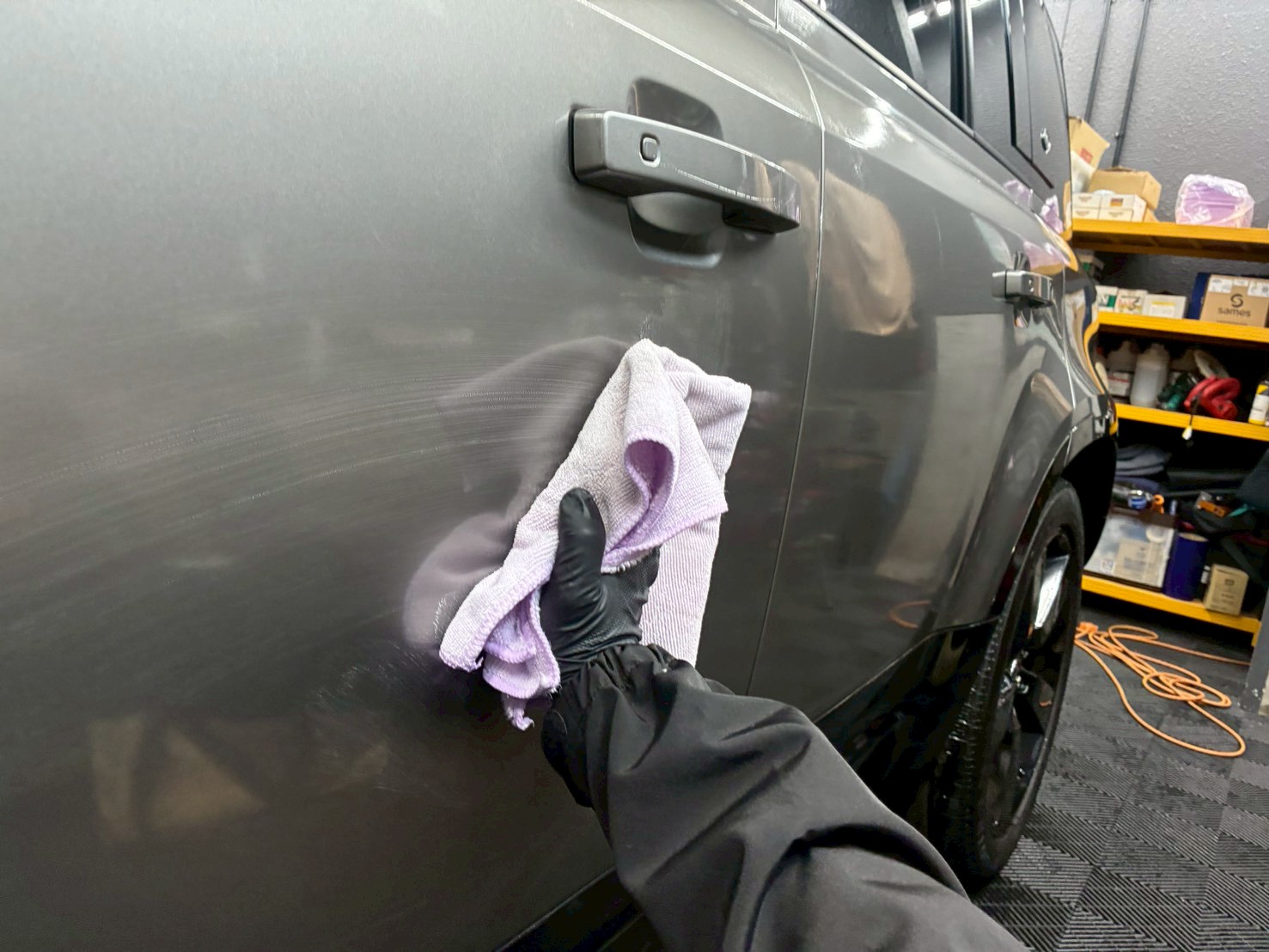 脱脂、仕上げ作業(ドア内の水滴除去、窓清掃、ホイール仕上げ、室内清掃)