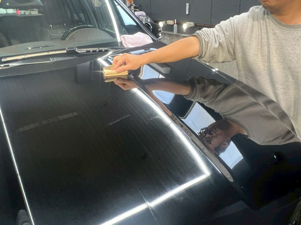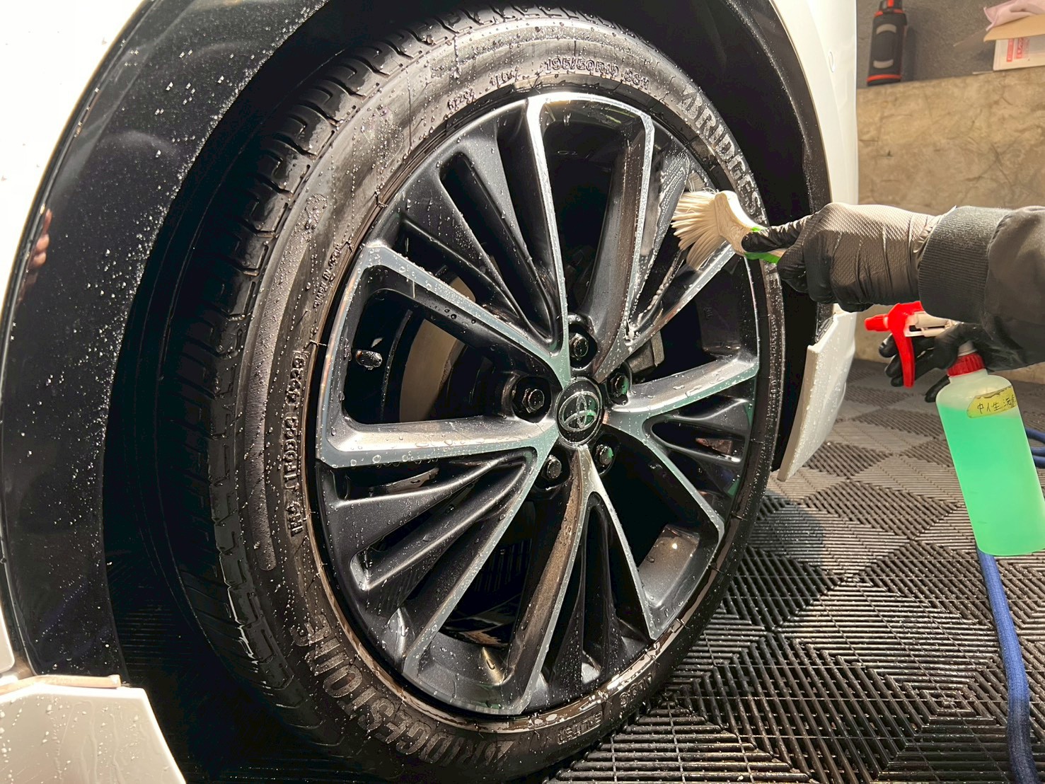 脱脂、仕上げ作業(隙間の磨き粉の除去、窓清掃、ホイール仕上げ、室内清掃)