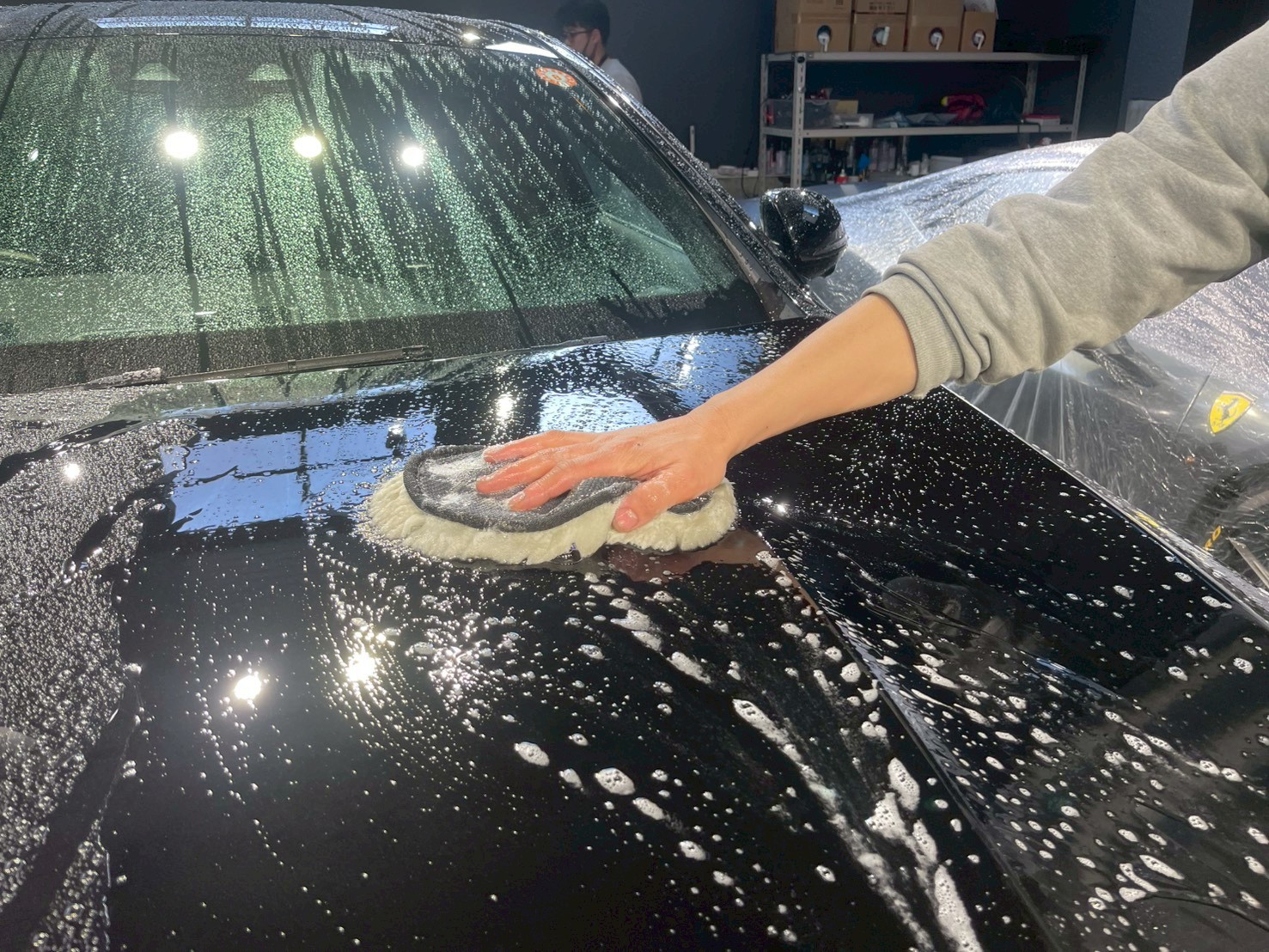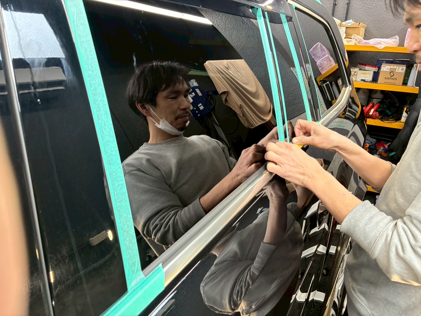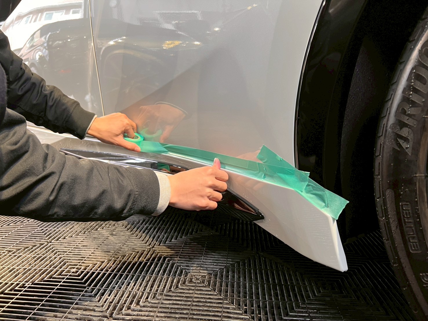 洗車が終わりましたら、施工する箇所の周りをマスキングで保護していきます。