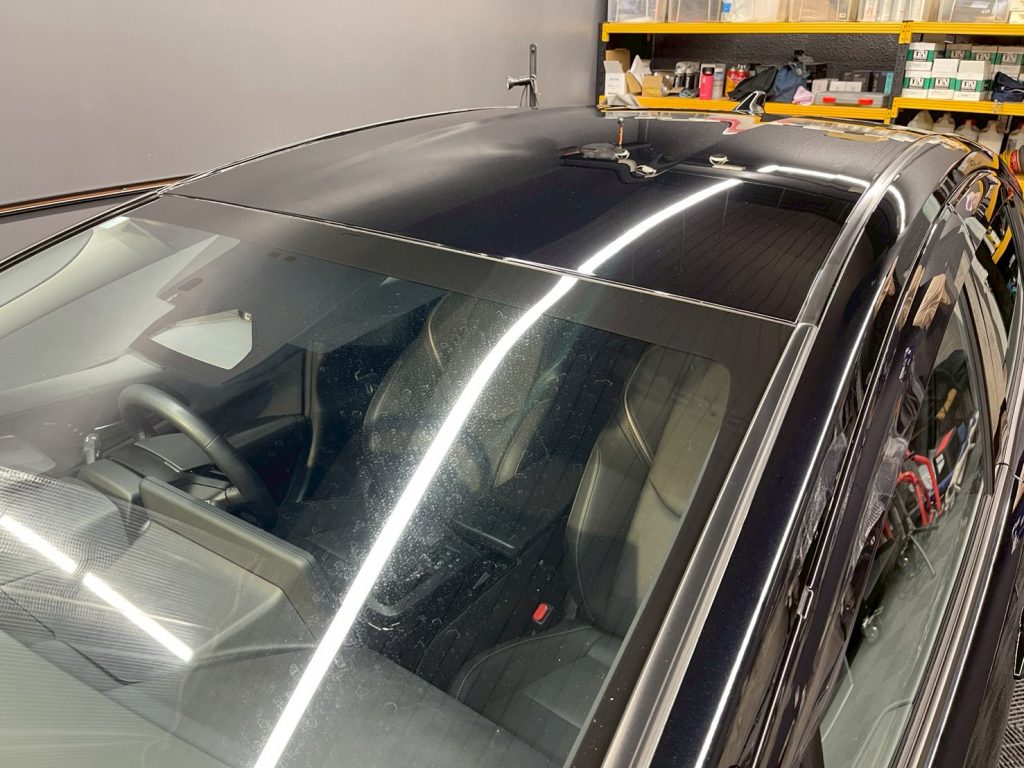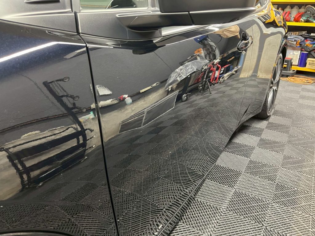 従来のボディガラスコーティングですと、ボンネット半分や1/4などで塗り分けができるんですが、セラミックプロは速乾性が高いので、プレスラインで細かく切りながら塗り込みます。