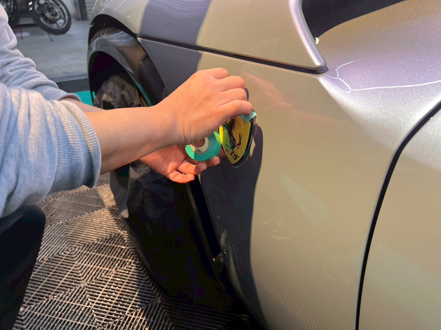 ブロアで水滴を飛ばし、ポリッシャーで磨く際に当たってはいけない箇所、磨き粉の浸入を防ぎたい箇所をマスキングテープで保護していきます。