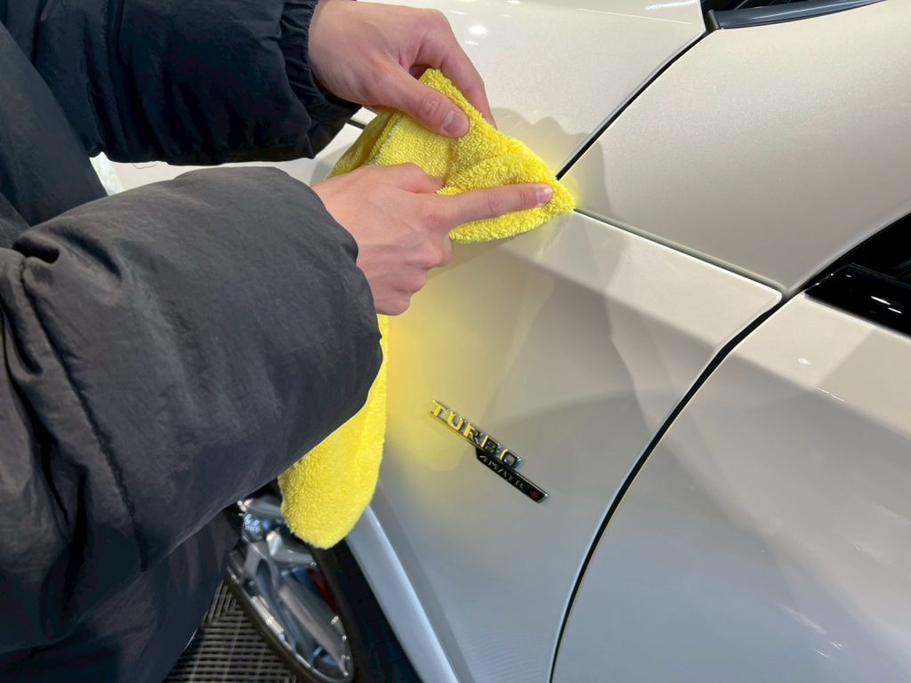 脱脂、仕上げ作業(ドアの内側などの水滴の除去、窓清掃、ホイール仕上げ、室内清掃)