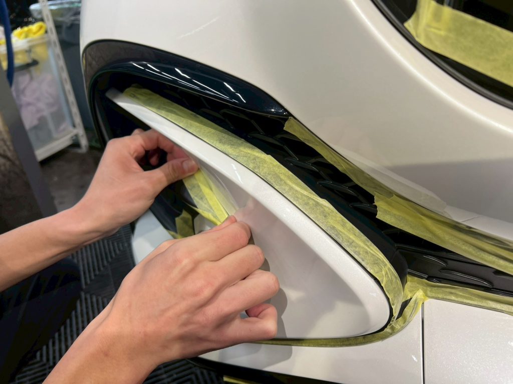 ブロアで水滴を飛ばし、ポリッシャーで磨く際に当たってはいけない箇所、磨き粉の浸入を防ぎたい箇所をマスキングテープで保護していきます。