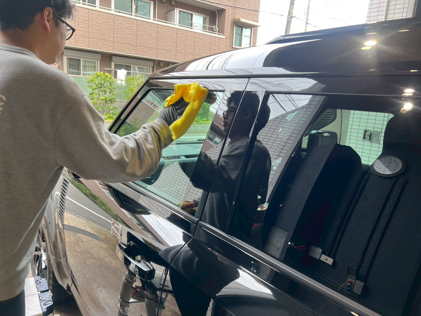 脱脂、仕上げ作業(ドア内の水滴除去、窓清掃、ホイール仕上げ、室内清掃)