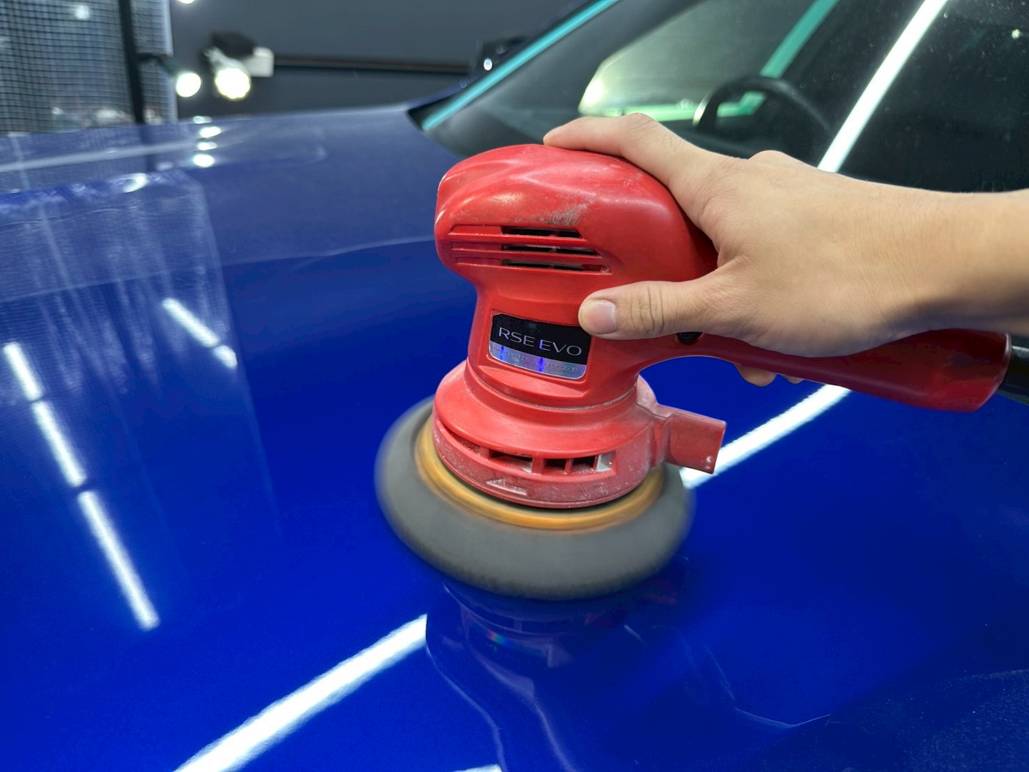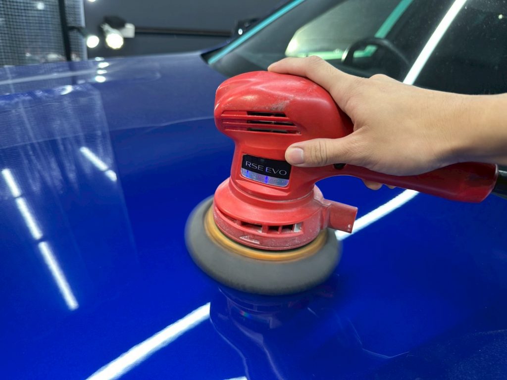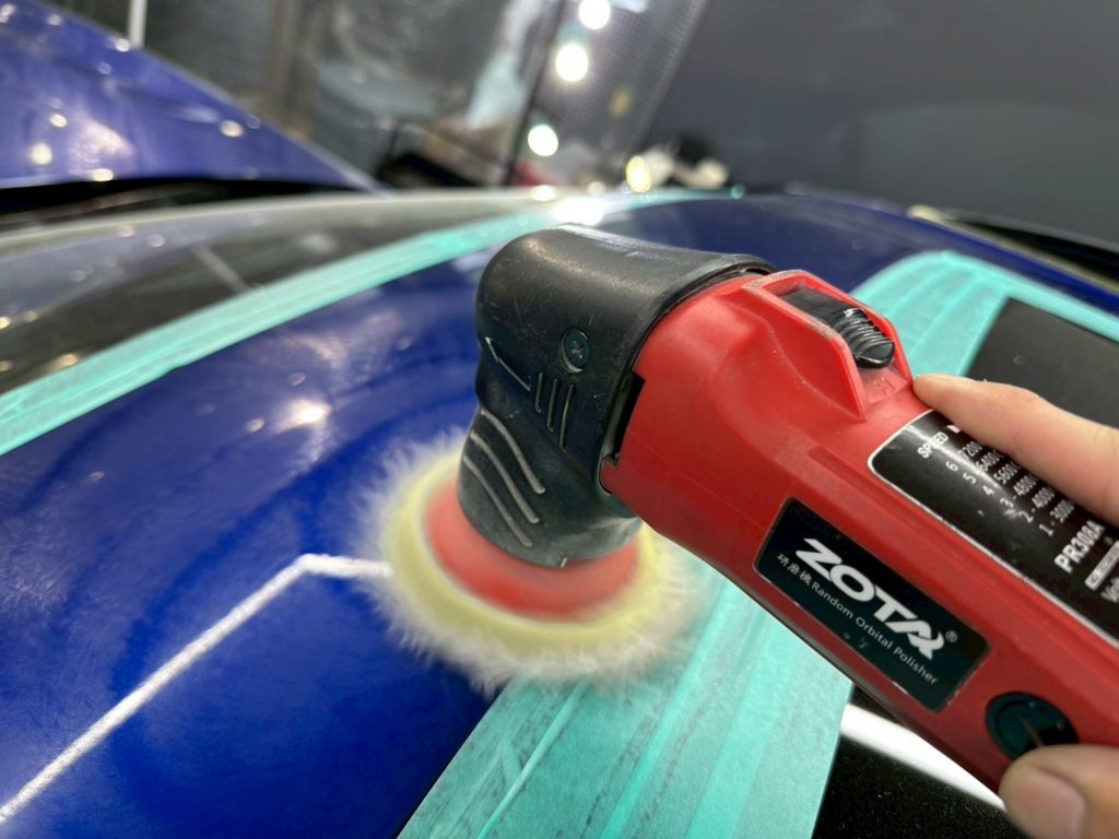 ブロアで水滴を飛ばし、ポリッシャーで磨く際に当たってはいけない箇所、磨き粉の浸入を防ぎたい箇所をマスキングテープで保護していきます。