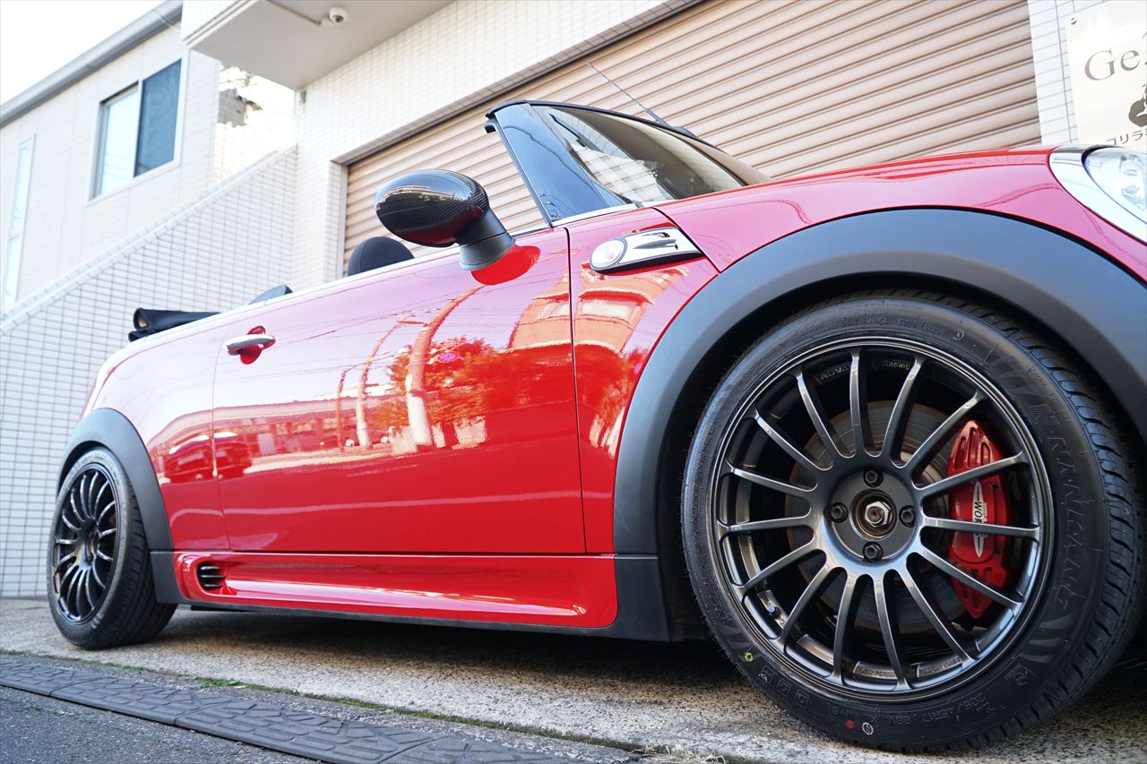 コンバーチブルJCWをベースに、ラルグス製フルタップ車高調/アドバンレーシング17インチアルミホイール を装着した、まとまりある上質カスタムを施した1台。走り・装備・スタイル、全てが揃った希少なJCWコンバーチブルです。