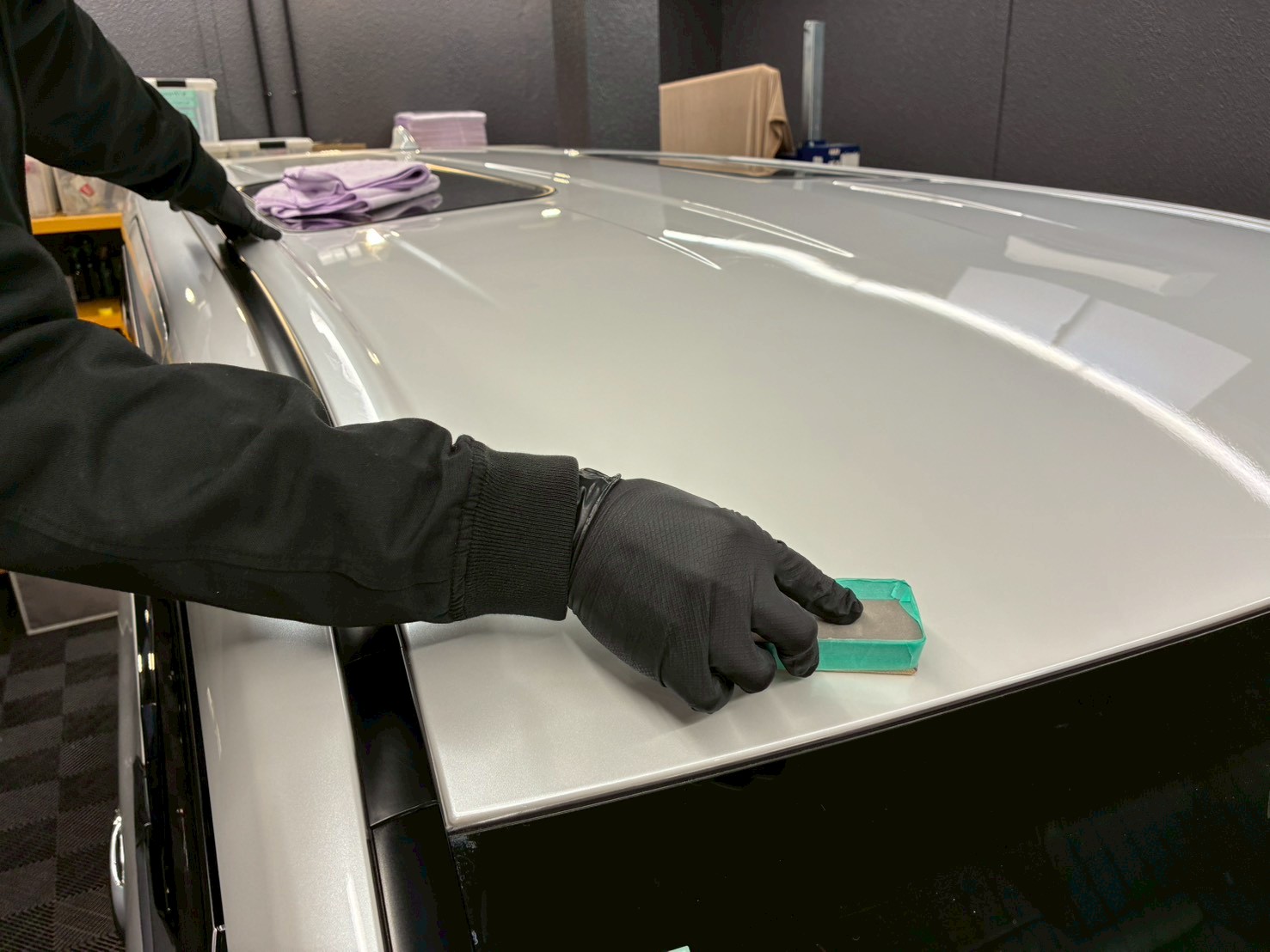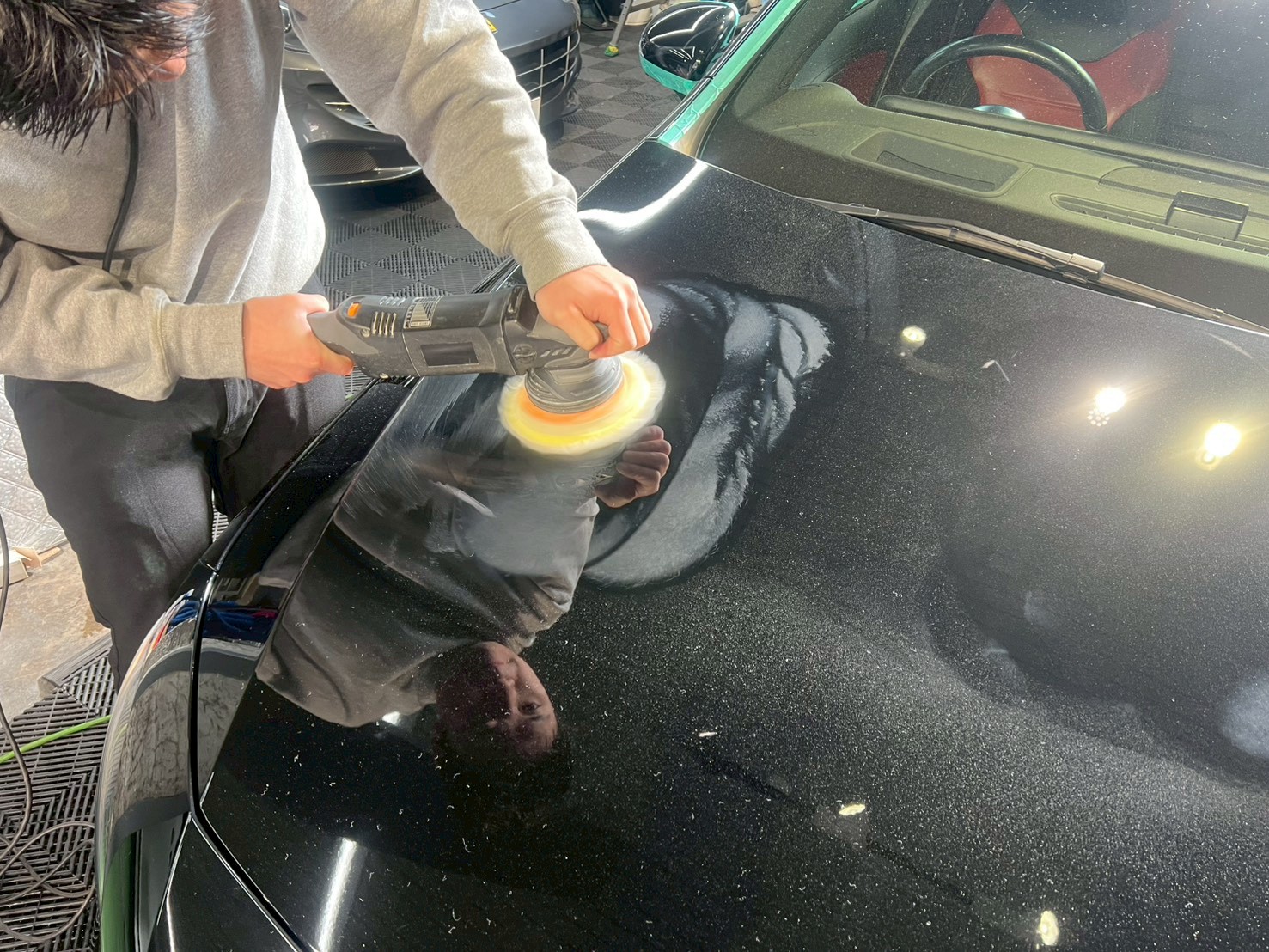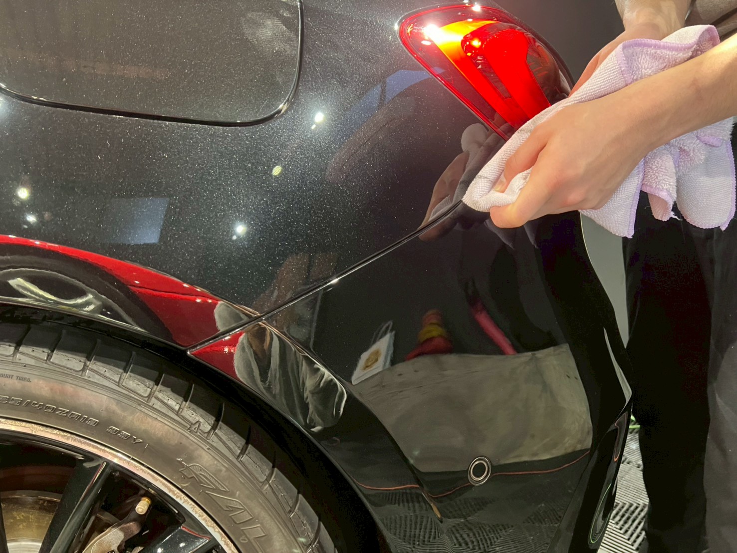 脱脂、仕上げ作業(ドアの内側や隙間の磨き粉の除去、窓清掃、ホイール仕上げ、室内清掃)