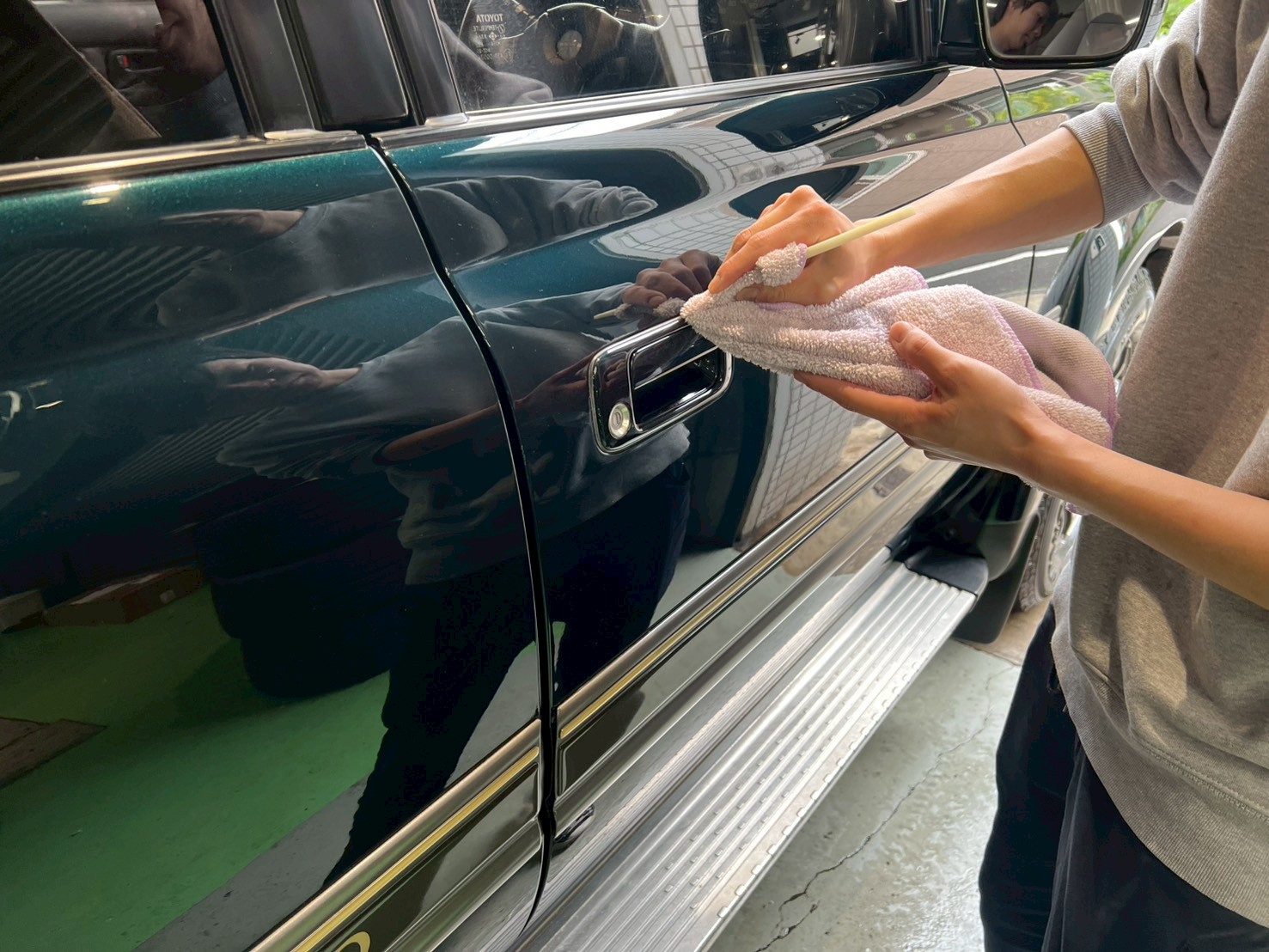 脱脂、仕上げ作業(ドアの内側や隙間の磨き粉の除去、窓清掃、ホイール仕上げ、室内清掃)