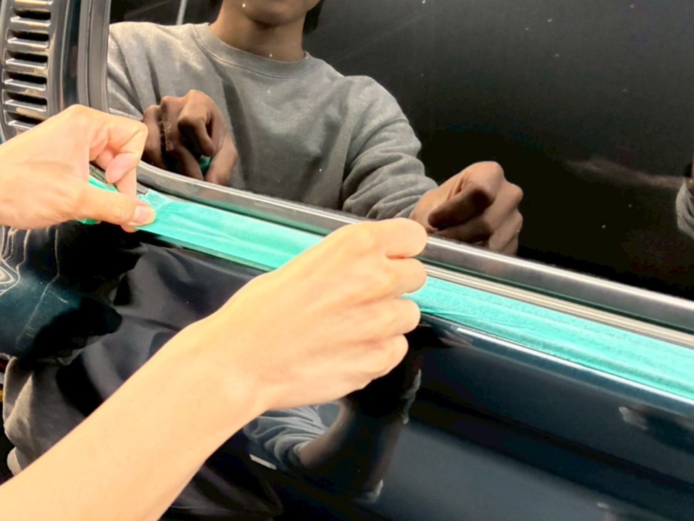 ブロアで水滴を飛ばし、ポリッシャーで磨く際に当たってはいけない箇所、磨き粉の浸入を防ぎたい箇所をマスキングテープで保護していきます。