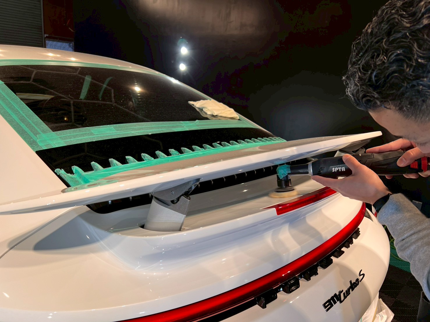 ブロアで水滴を飛ばし、ポリッシャーで磨く際に当たってはいけない箇所、磨き粉の浸入を防ぎたい箇所をマスキングテープで保護していきます。