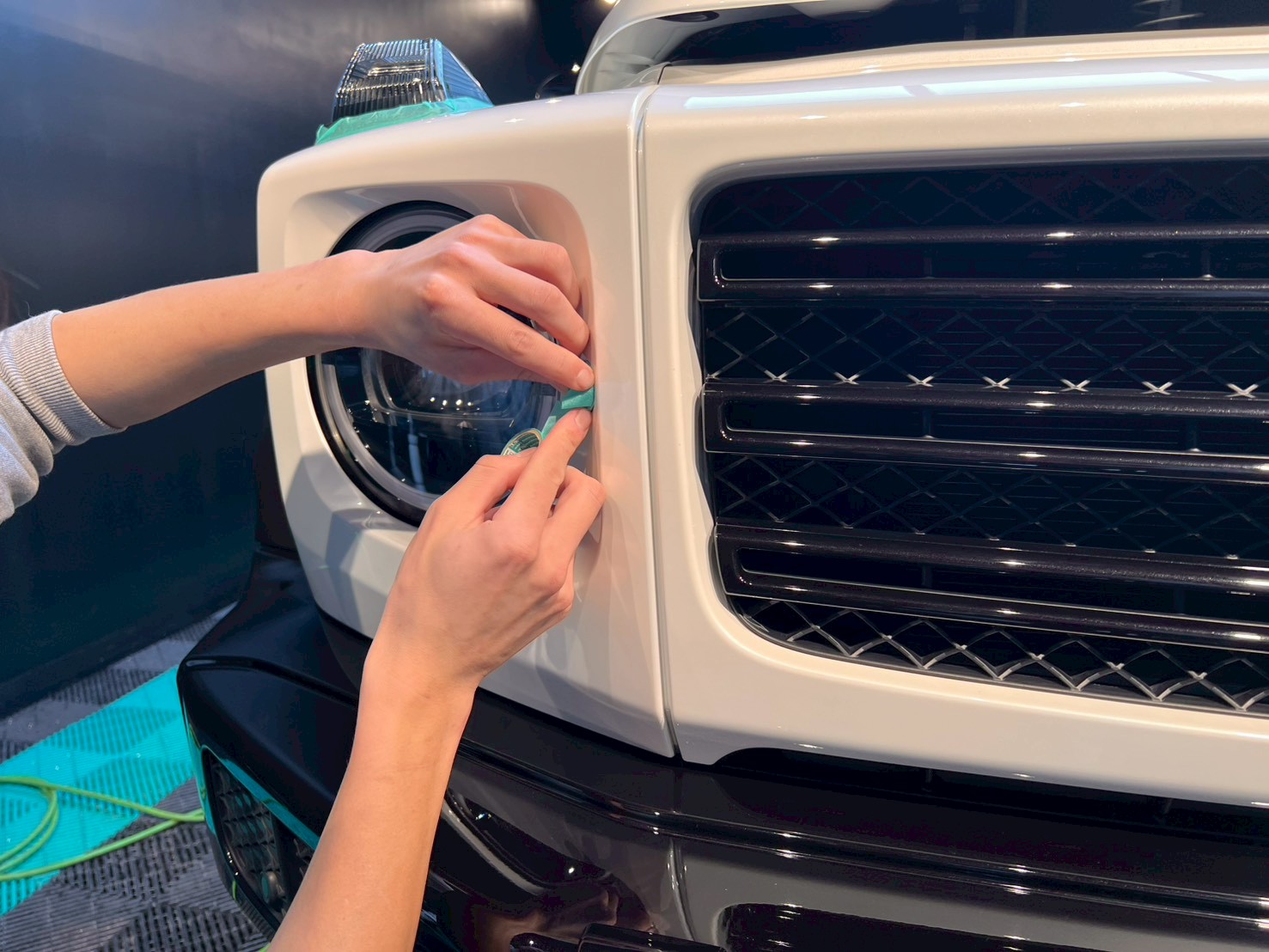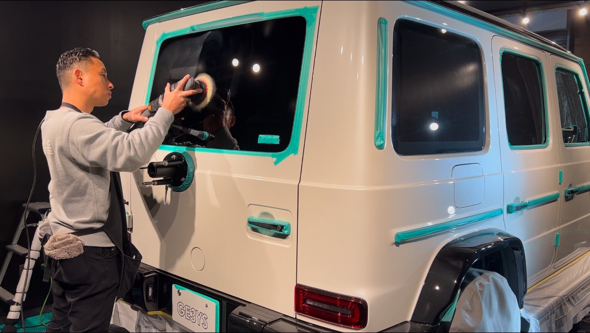 ブロアで水滴を飛ばし、ポリッシャーで磨く際に当たってはいけない箇所、磨き粉の浸入を防ぎたい箇所をマスキングテープで保護していきます。